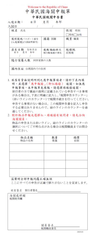 1.税関申告書(海關申報單)を機内でCAから貰って下さい。一部LCCでは、常備されていない事もありました。その場合は到着後、税関のレッドラインカウンターにいる職員に"請給我海關申報單”と書いたメモを見せ税関申告書を貰い所定の内容を記入してください。(カウンター前に机と筆記用具があります。)