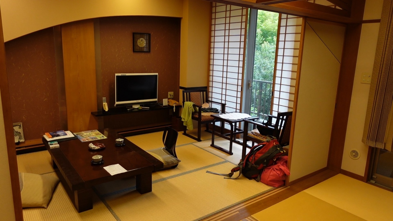 客室は、10畳広縁付き、空の冷蔵庫ありです。予め布団が敷いてあるので、風呂上がりにゴロンとするにはよいかも。