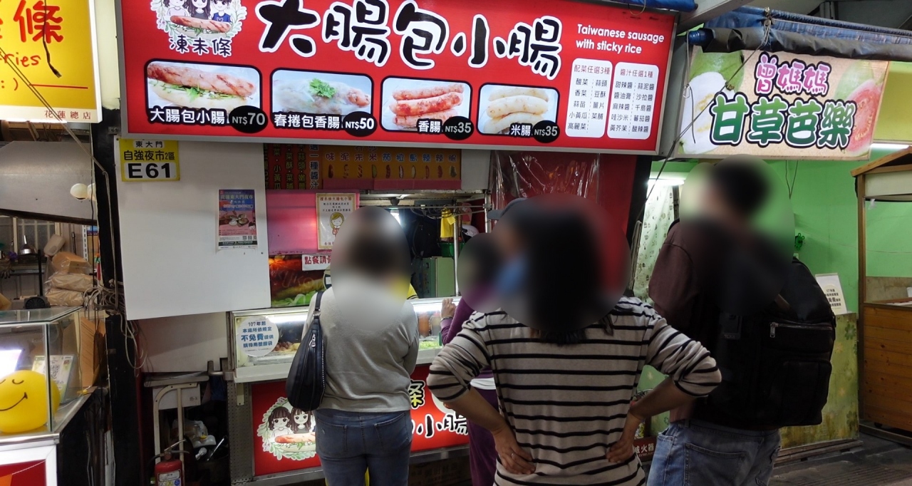 自強市場をメインに散策しましたが、花蓮名物とのことなので大腸包小腸という屋台で買いました。イートインスペースがあるのでそこで食べようとしたらステーキ屋台の若い店員さんがメニューを持ってきて、ここは駄目?と日本語で言ったら眉毛を下げて困った顔してたので移動しました。赤い椅子のエリアは各店舗専用みたい。青い椅子がフリースペースのようでそこで食べました。かなりボリューミーで美味しかった。