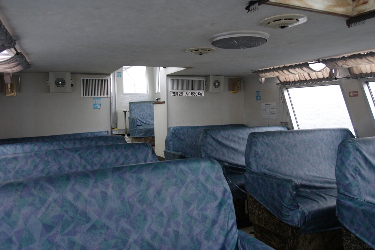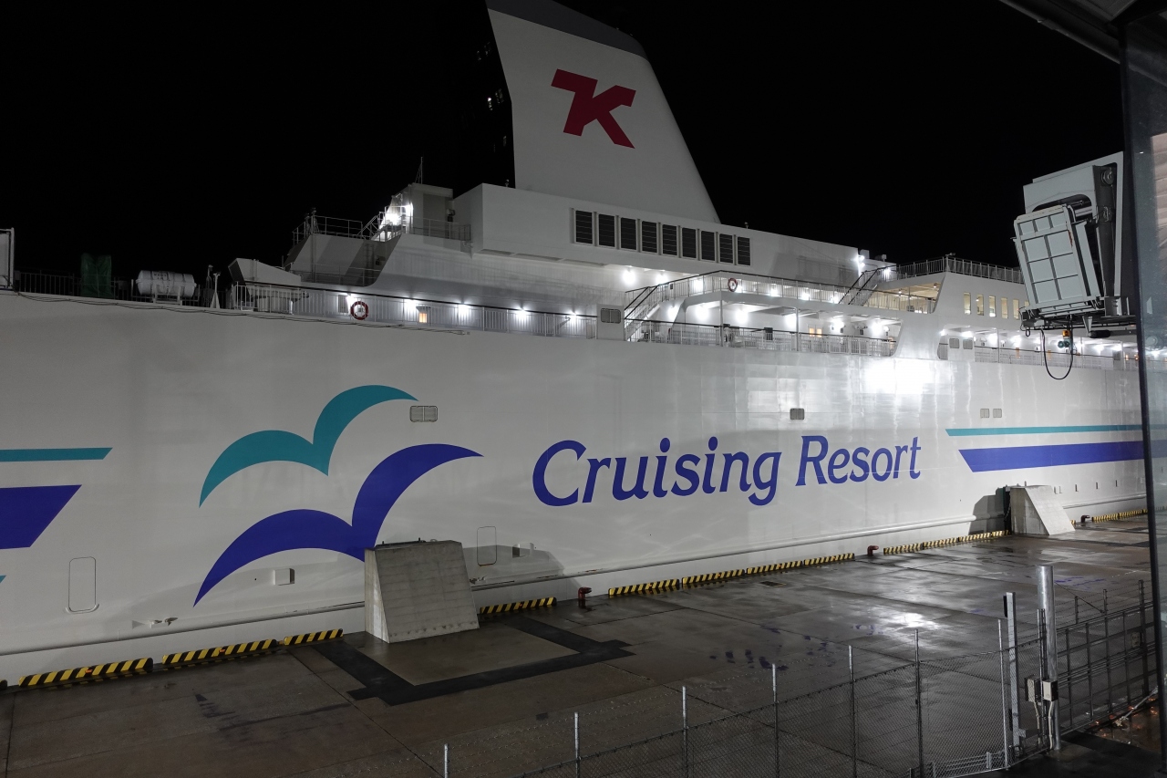 出港時刻には台風は茨城付近に抜けていたので、後半は揺れは大丈夫だろうと期待を込めて乗船。台風対策で、徒歩での乗船客はボーディングブリッジからではなく、ワンボックスカーに便乗して車両甲板からの乗船でした。