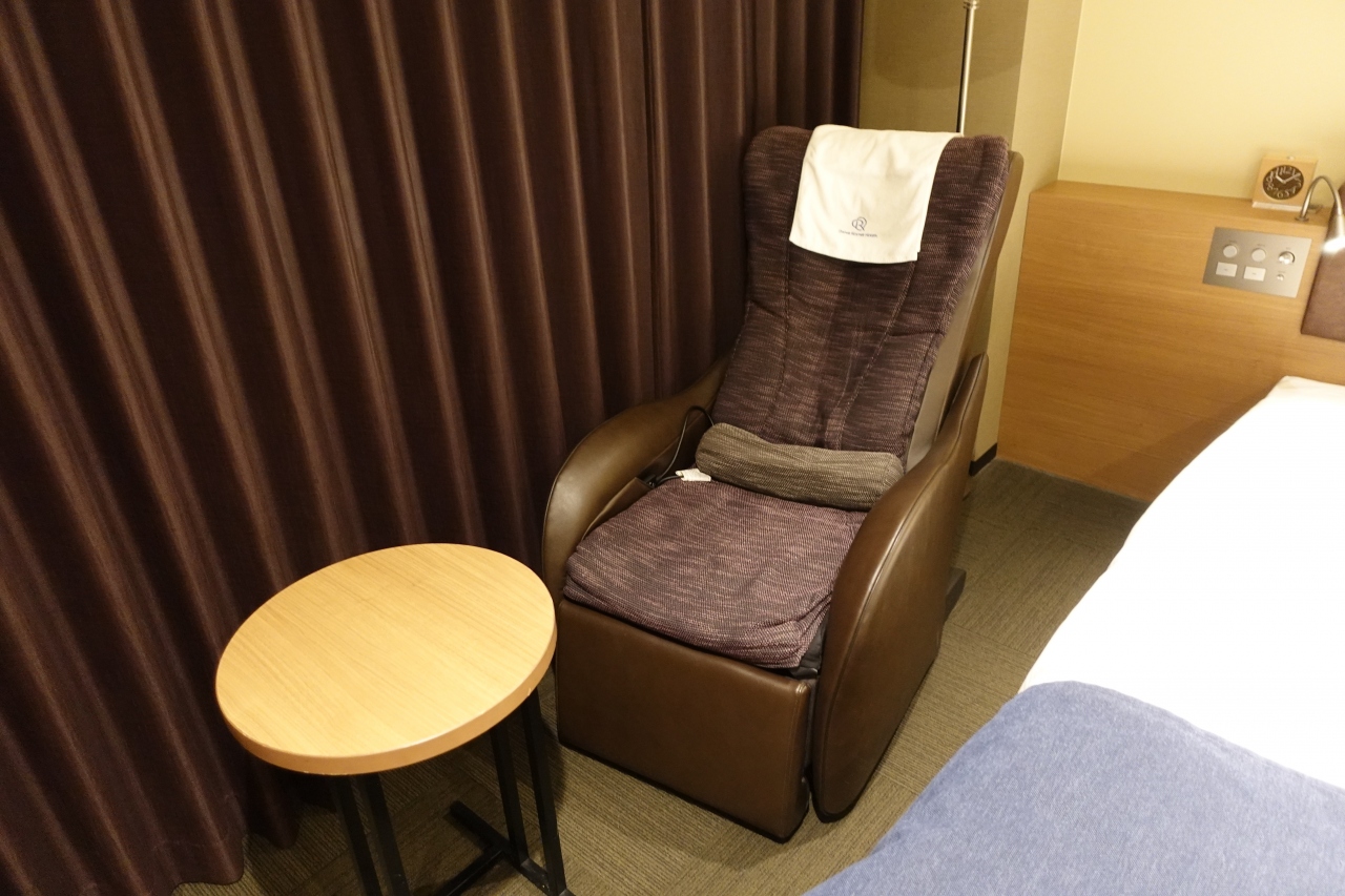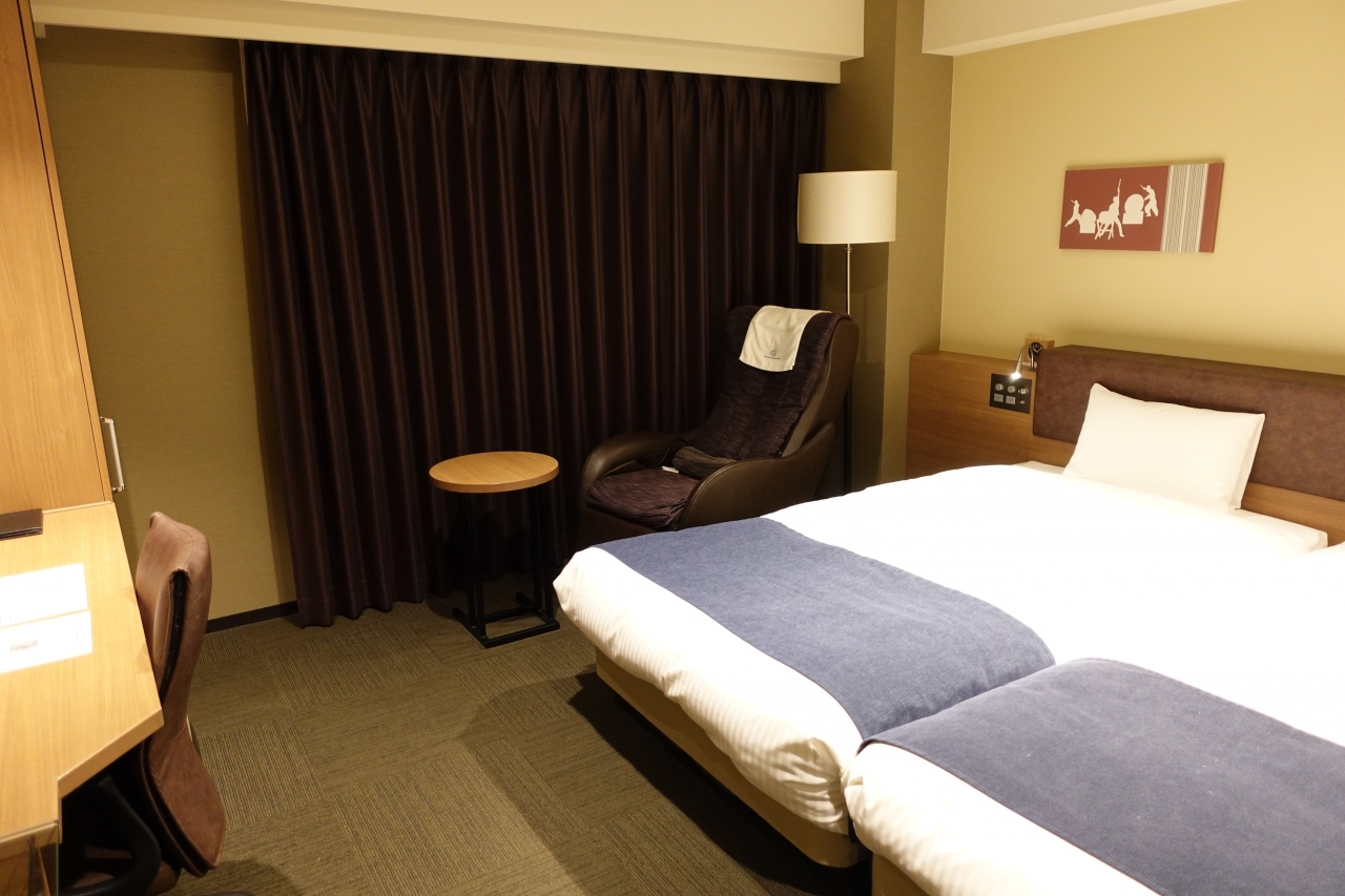部屋はセミダブルベッドが2つあり、マッサージチェアが置いてあるのでたいへん寛げました。風呂は三点ユニットではなく、バスルーム、トイレが独立しているのでゆっくりお風呂に浸かれるのでリラックスできました。ただし、洗い場に椅子が無いのは不便でした。