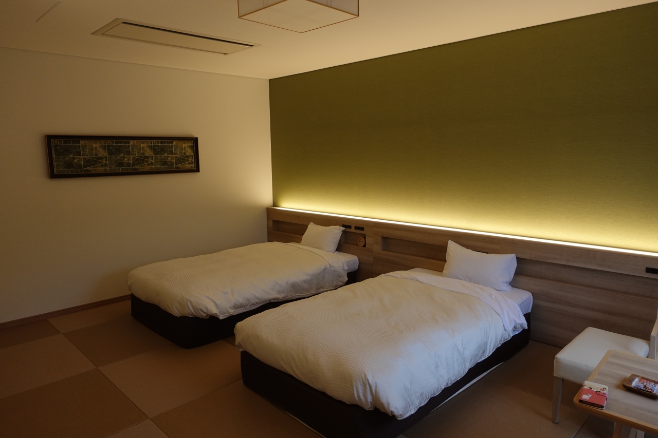 客室は広々としたツインルームで、和のテイストを上手く織り込んだ落ち着いた内装でした。少し気になったのがウォシュレットの調子が少し悪かったのでそろそろ更新時期かな。