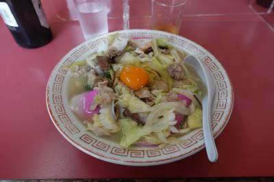 注文してすぐ着丼。スープは長崎の町中華系のあっさりしたちゃんぽんで美味しかったです。生卵、レバーが入っているのがユニークでした。
