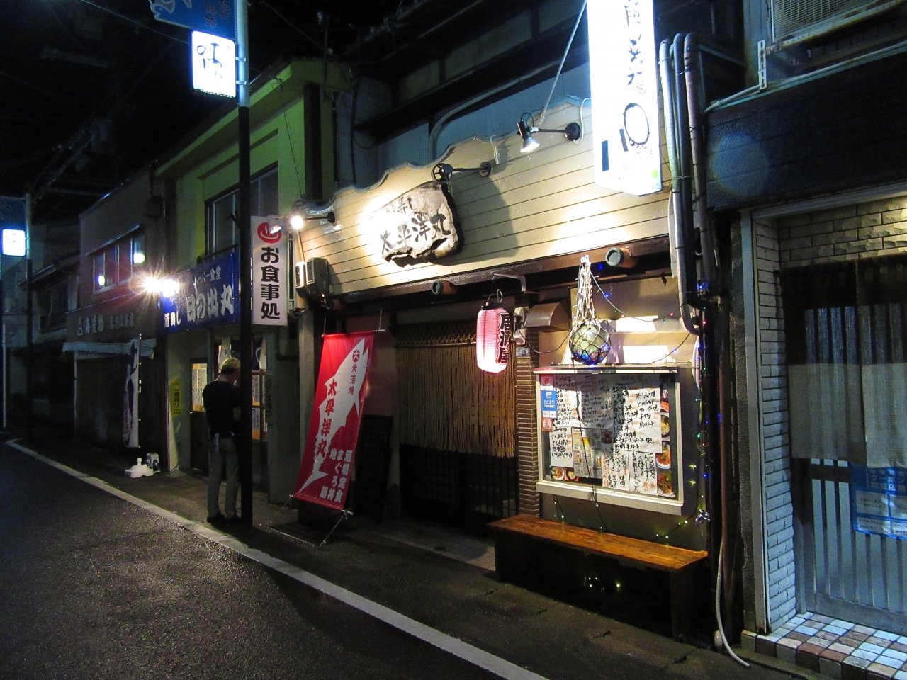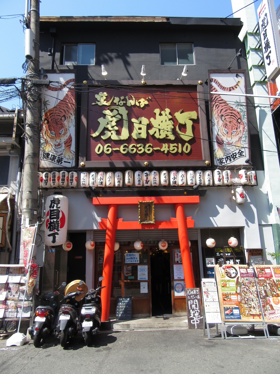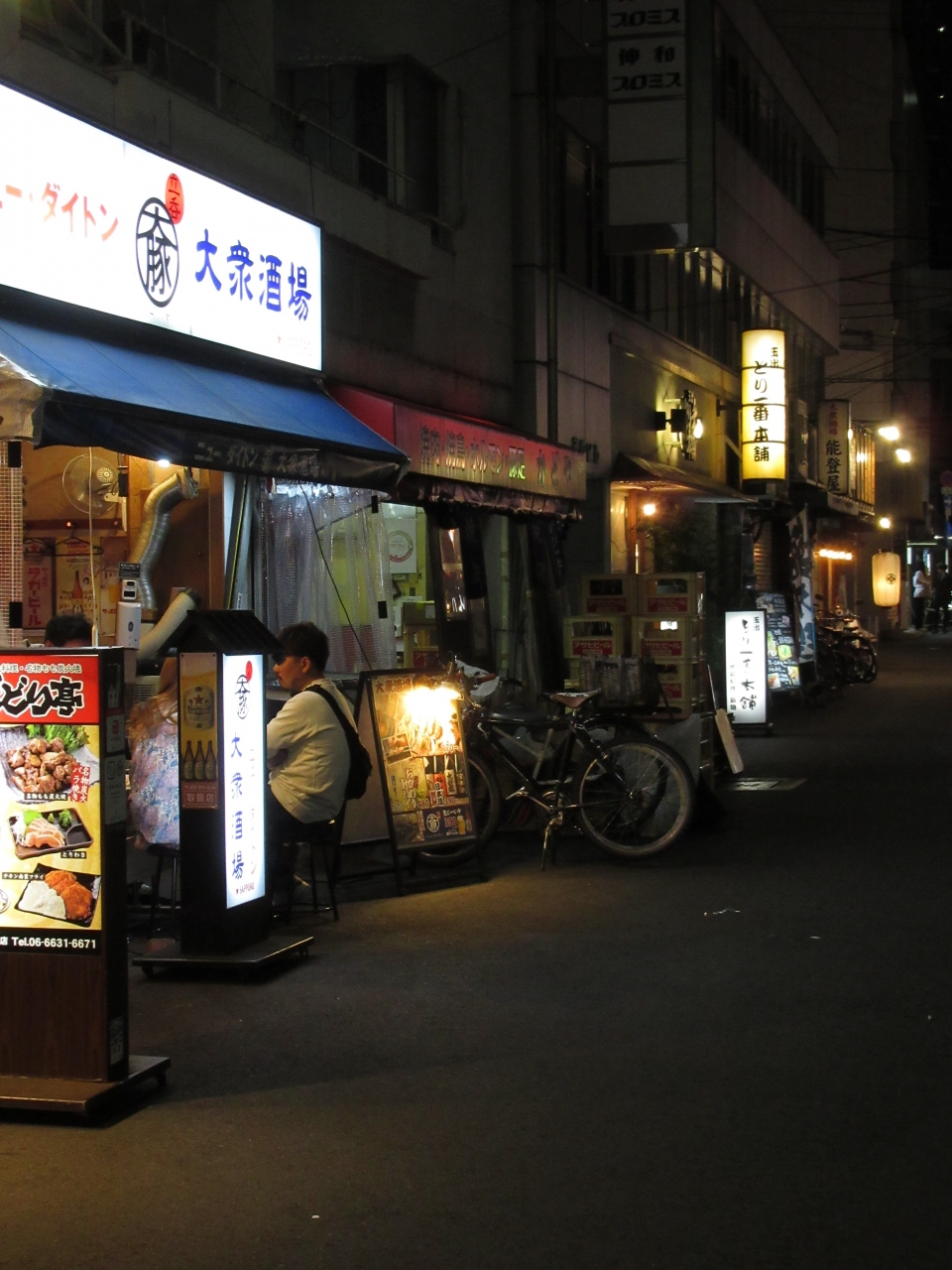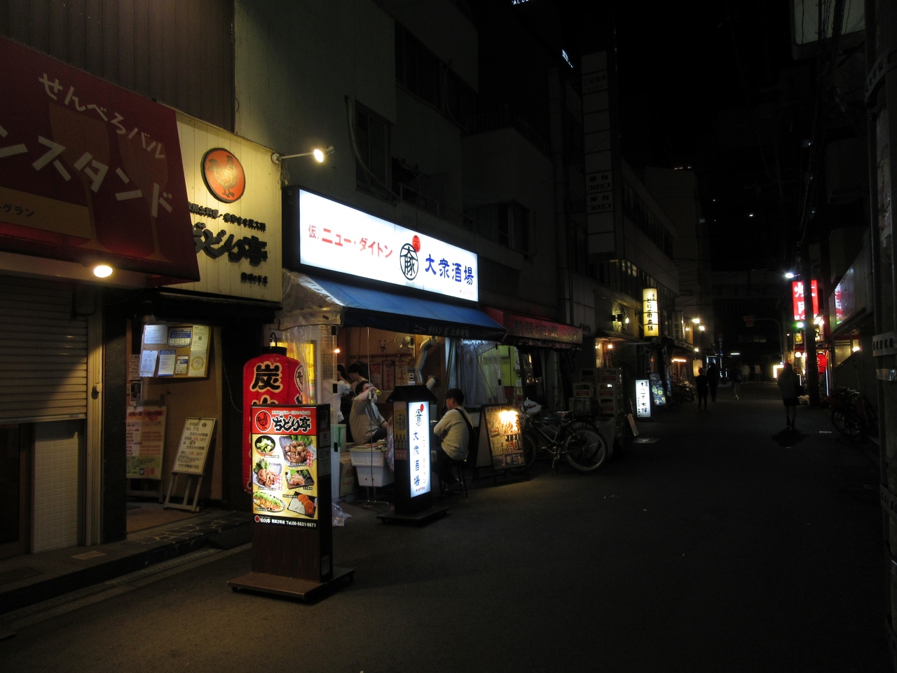 難波南海通りにある屋台村です。店内は9つの店からなり、自分の気に入った店で食べるのも良し、他店から出前を取るのも良し、はしごするのも良しとなかなか楽しめるお店でした。
