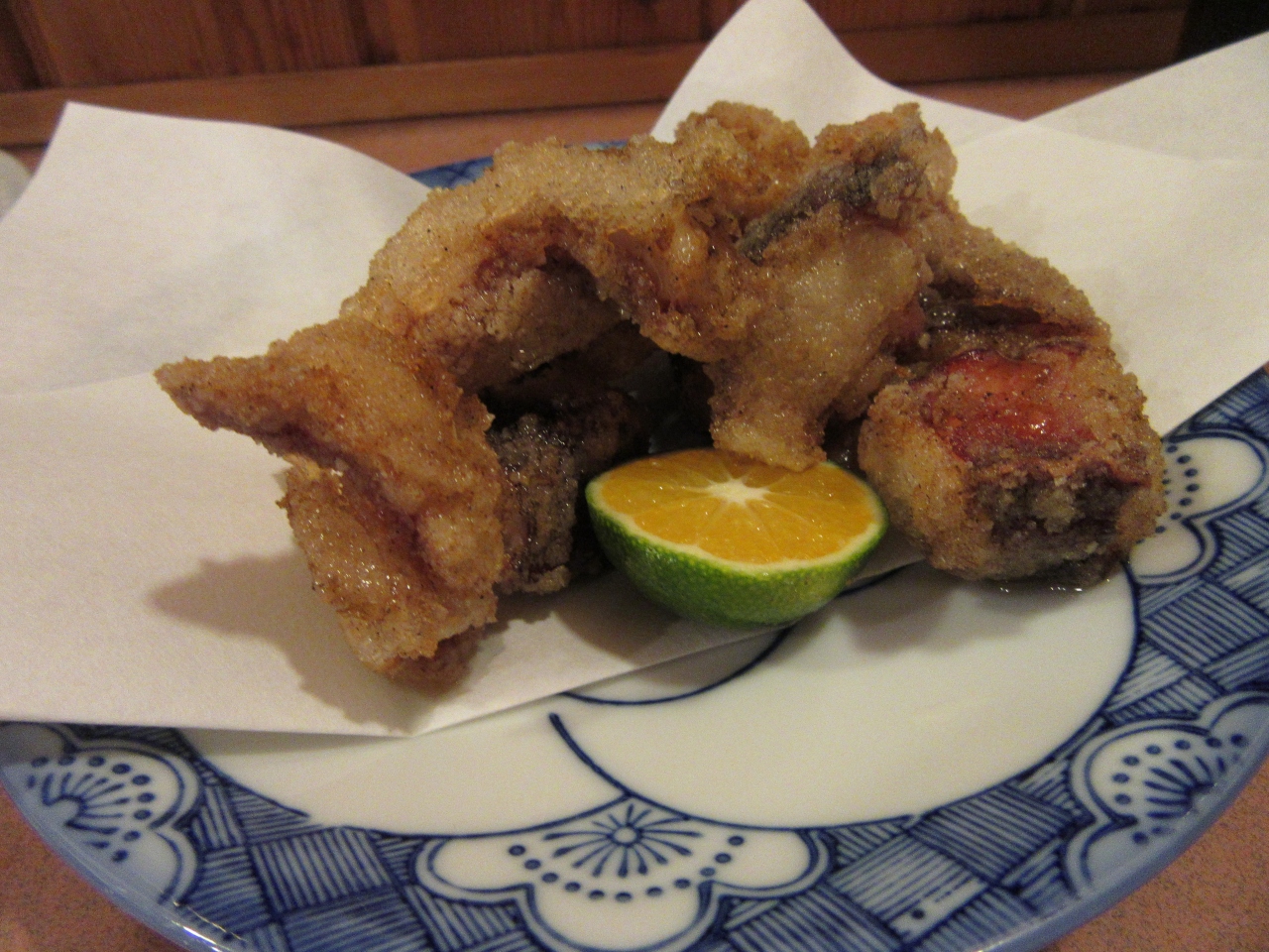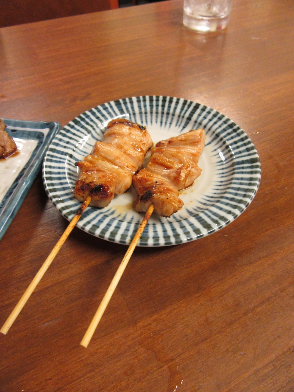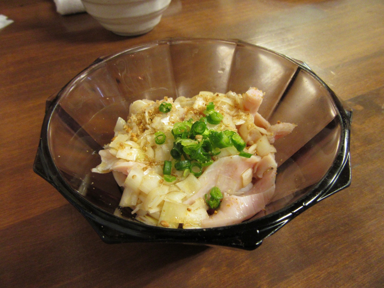 メインの焼き鳥モモ(カタイ)は期待していたのですが、調理済の鳥を炙って提供しているようで、肉のジューシーさも無くモソモソした食感で期待外れ。冷製のシンゾウも、臓物臭さが前に出ていて駄目。餃子も食感がモソモソでこれも全然駄目でした。