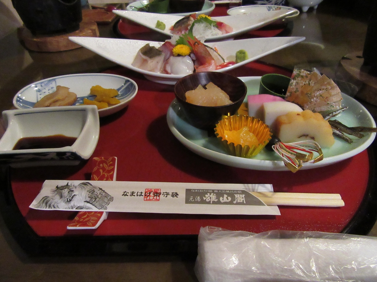 食事は男鹿半島の魚介が並び、大変美味でした。男鹿名物の石焼桶鍋は味、見た目共に圧巻です。大晦日に、なまはげが館内に訪れ貴重な体験をさせていただきました。宿泊客に台湾からのお客さんがいて、周りのお客さんから「台湾から来たんですって!。桶鍋に石を入れてみて!!」と体験させてあげたりと大歓迎されていました。震災の際の援助を忘れない人々の暖かさを感じました。