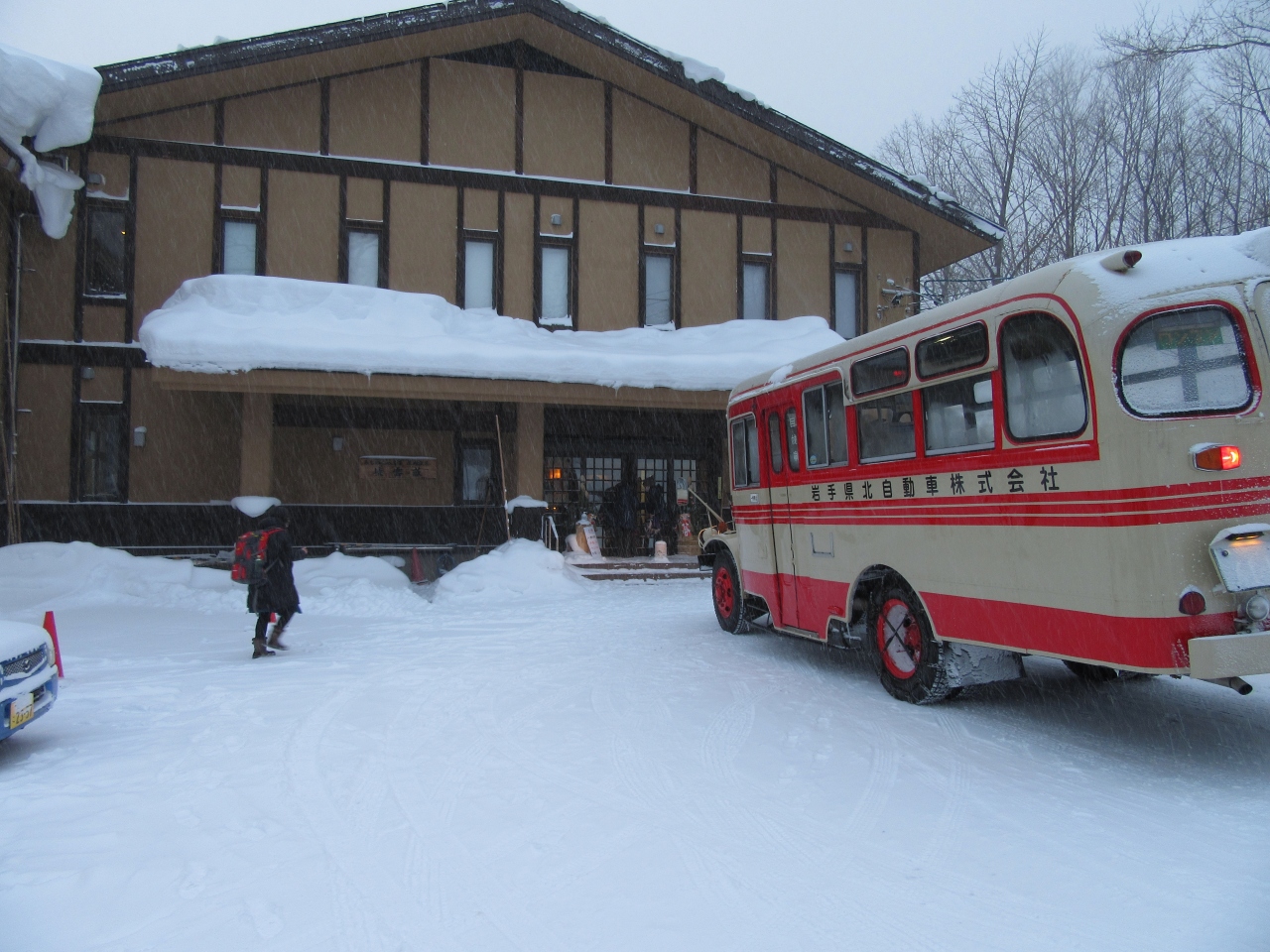 アクセスは盛岡駅東口から岩手県北バス松川温泉行き終点下車すぐです。冬季は途中車輌交換があり、4WDのボンネットバスに乗り換えます。