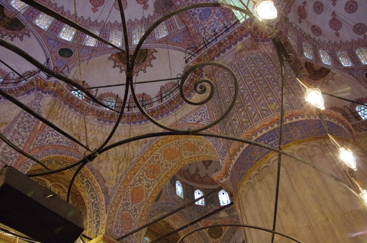 ブルーモスクはよく知られた外観もすごいが内部はモザイクの天井やステンドグラスなどイスラム建築に圧倒される。一時間30分ぐらいの滞在だったが何度見ても見飽きることがない。