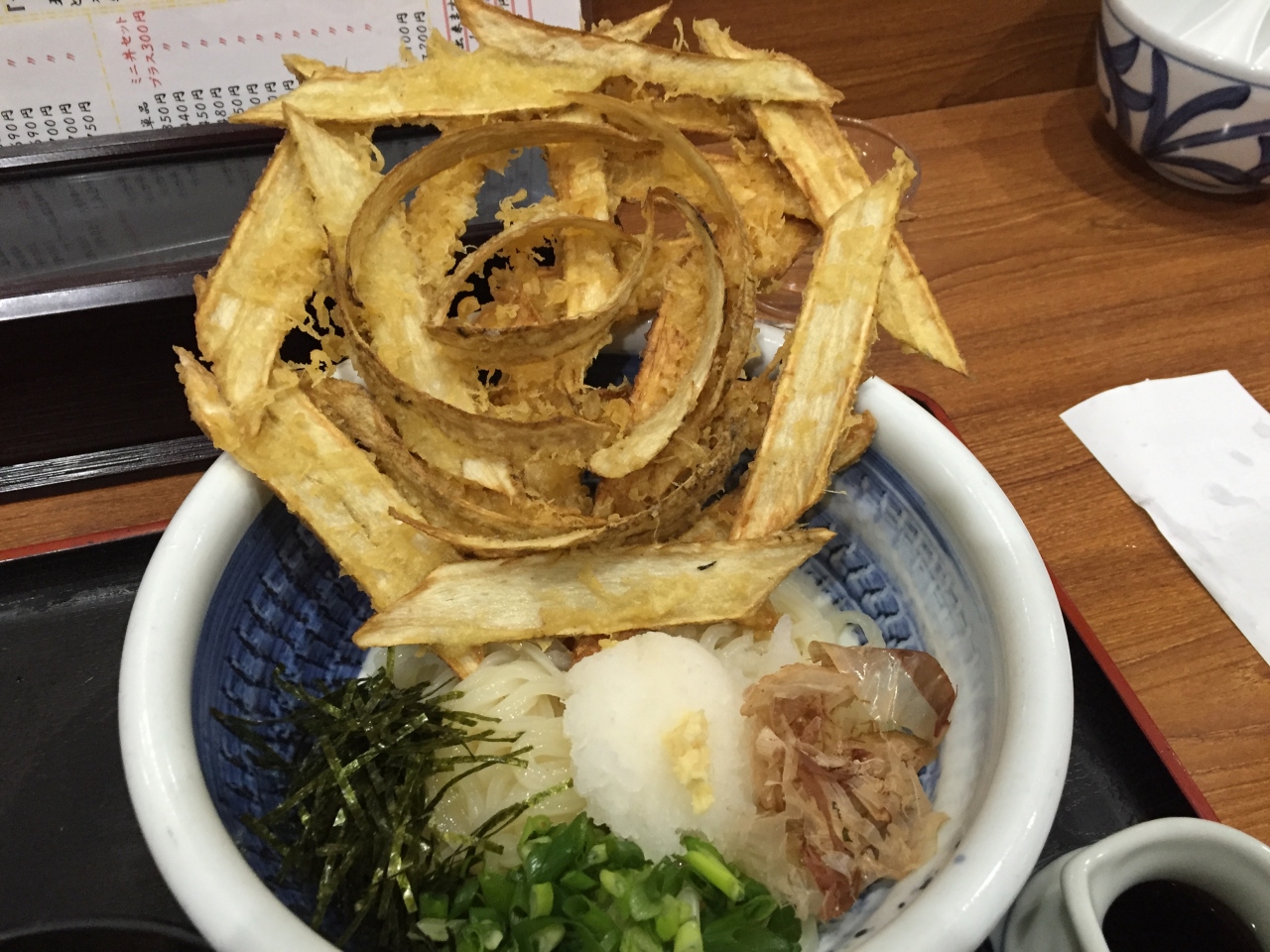 北九州で人気がじわじわきている豊前裏打ち会のうどん店です。おうどんの特徴は他のお店と同様、つるつるでこしのある細麺です。このお店の名物は、びっくりな大きさのゴボウ天。ゴボウのあまみがあっておいしかったです。