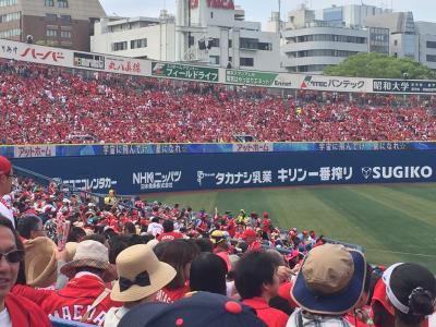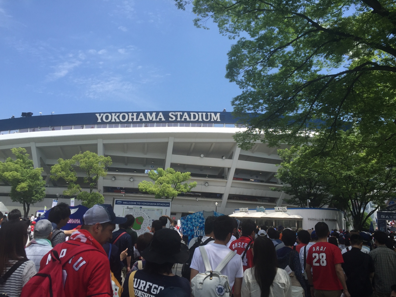 関内駅から徒歩5分ほどで到着しました。駅についてからは、球場に向かう人の大きな流れで迷うことなく到着。中の売店は試合前はかなり込み合っていました。球場なのに、女性用トイレも広くてきれいなのはすごくいいですね。日曜日のカープ戦。3塁側は90%くらいカープファンでしめられていて感激しました。小さいですがカープのグッズも中でうられていました。