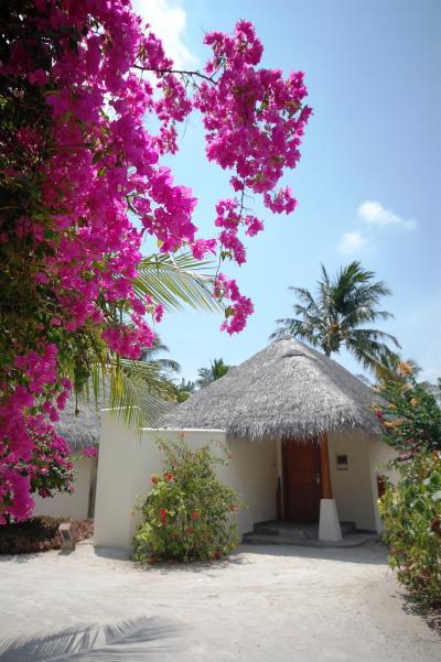私たちは水上ヴィラに宿泊しましたが、陸上コテージはこんな感じでした。茅...