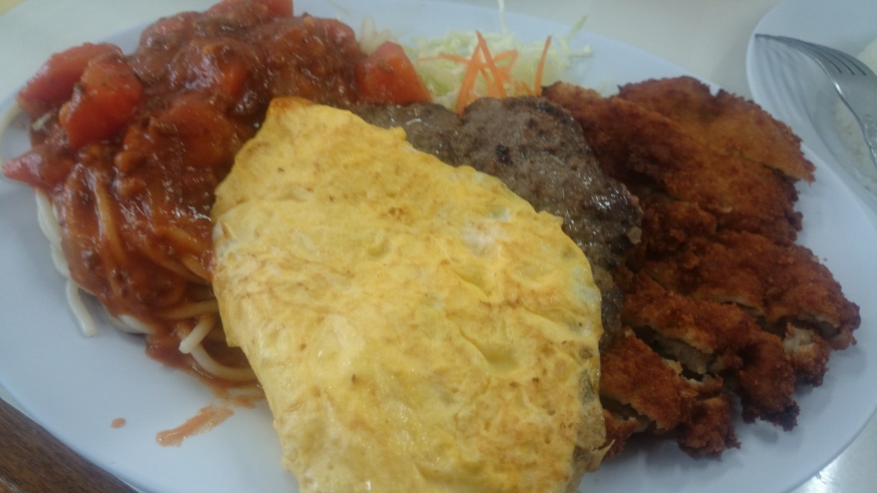 過酷飯ですね・・・ スパゲッティ、ハンバーグ、卵、 豚カツ と 物凄いボリュームです