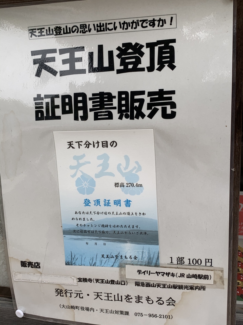 『天王山登頂証明書』 がJR山崎駅前のコンビニ デイリーヤマザキで 販売されています。