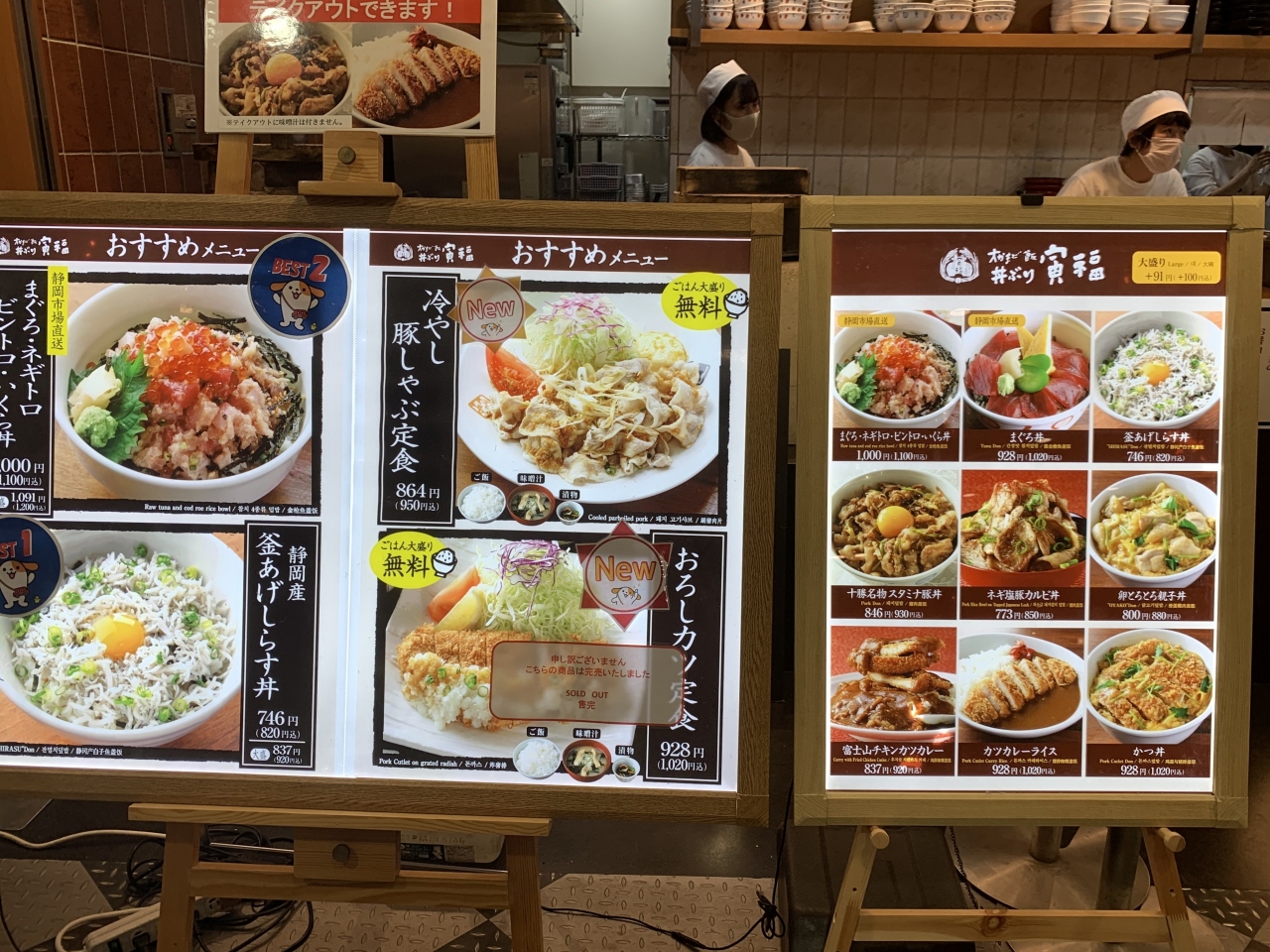 ごはん大盛りの嬉しいメニューもありますが、夜7:30過ぎで、完売メニューもありました。- 旅行時期