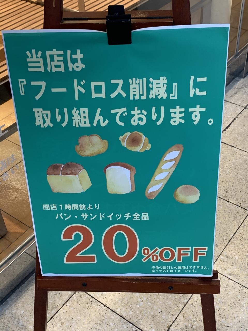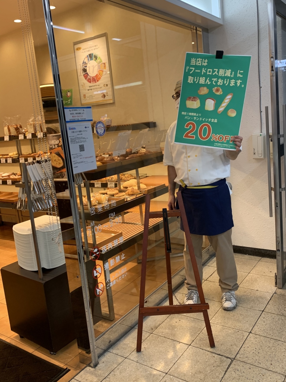「当店は フードロス削減に取り組んでおります。閉店1時間前より、パン・サンドイッチ 全品 20%OFF 」 と書かれたものを持って お客さんに呼びかけていました。