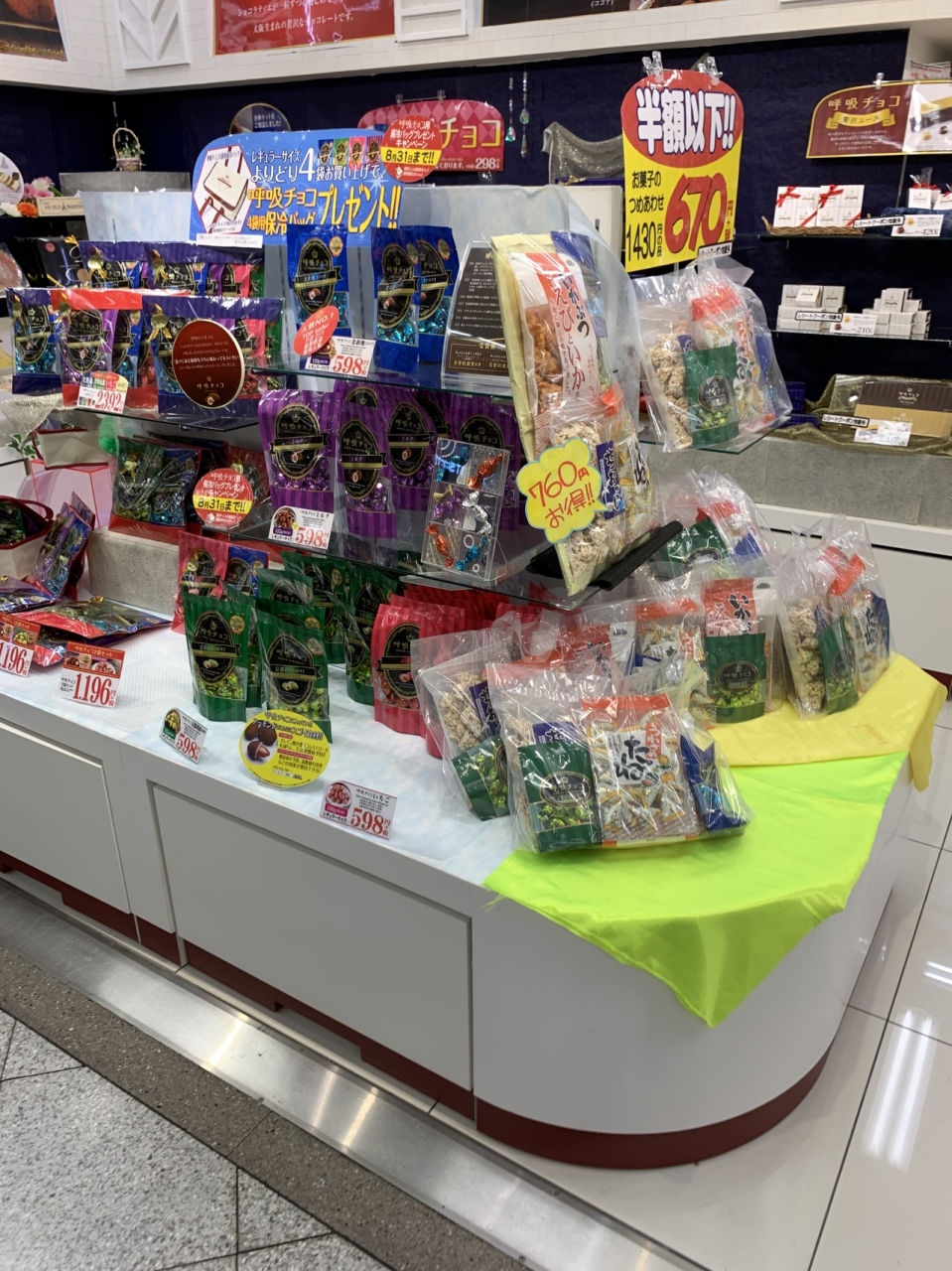 店内は お菓子の詰め合わせが 半額以下で売られていて お得 (^^)