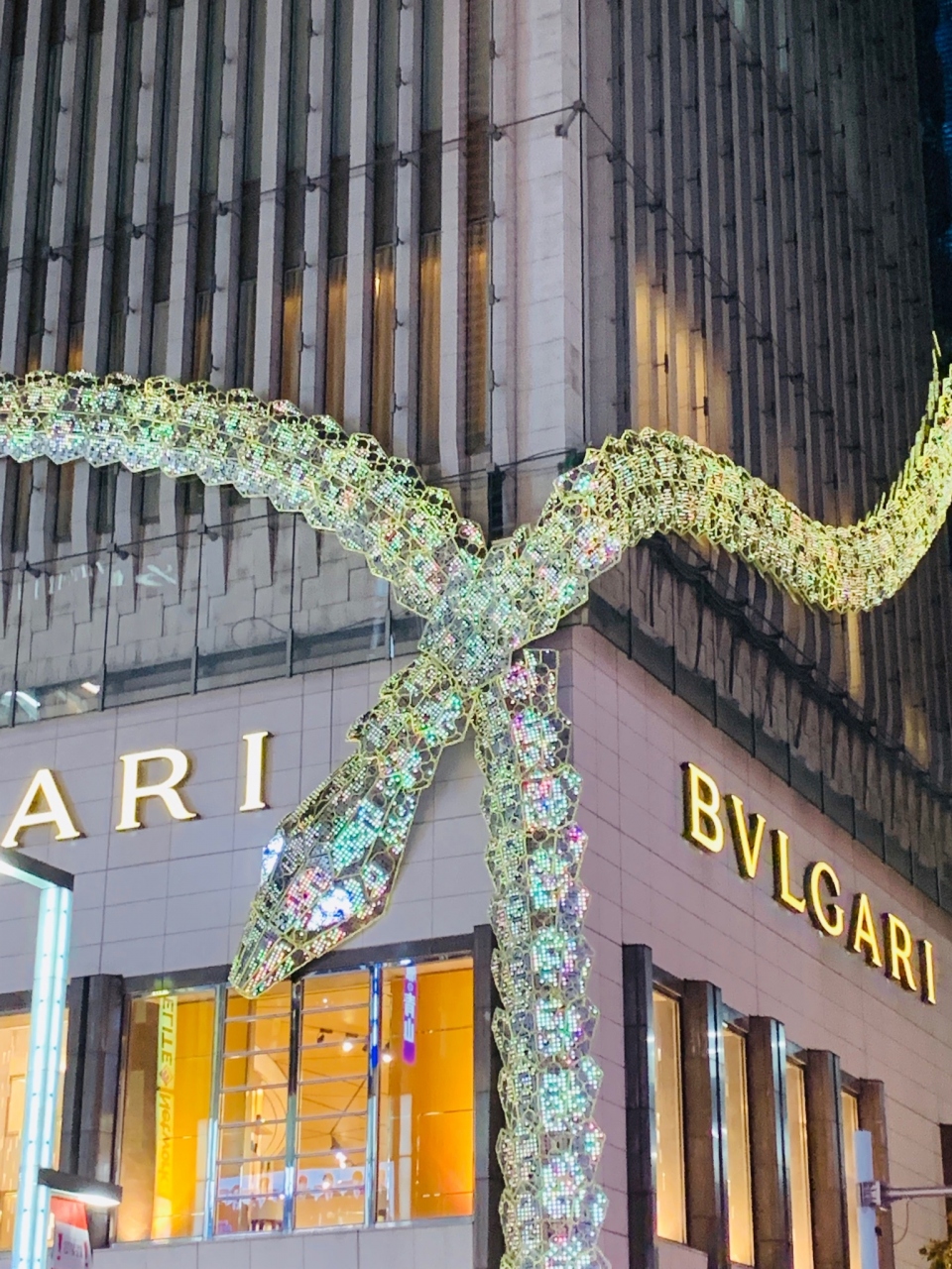 キラキラ光る ヘビ が ブルガリの ビルに巻きついてる感じ で キョウレツ~!