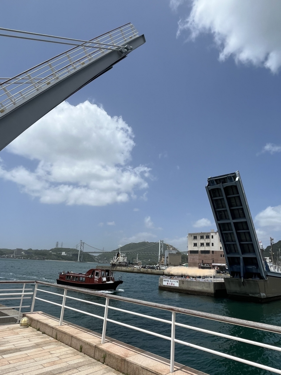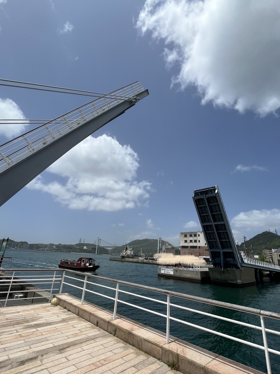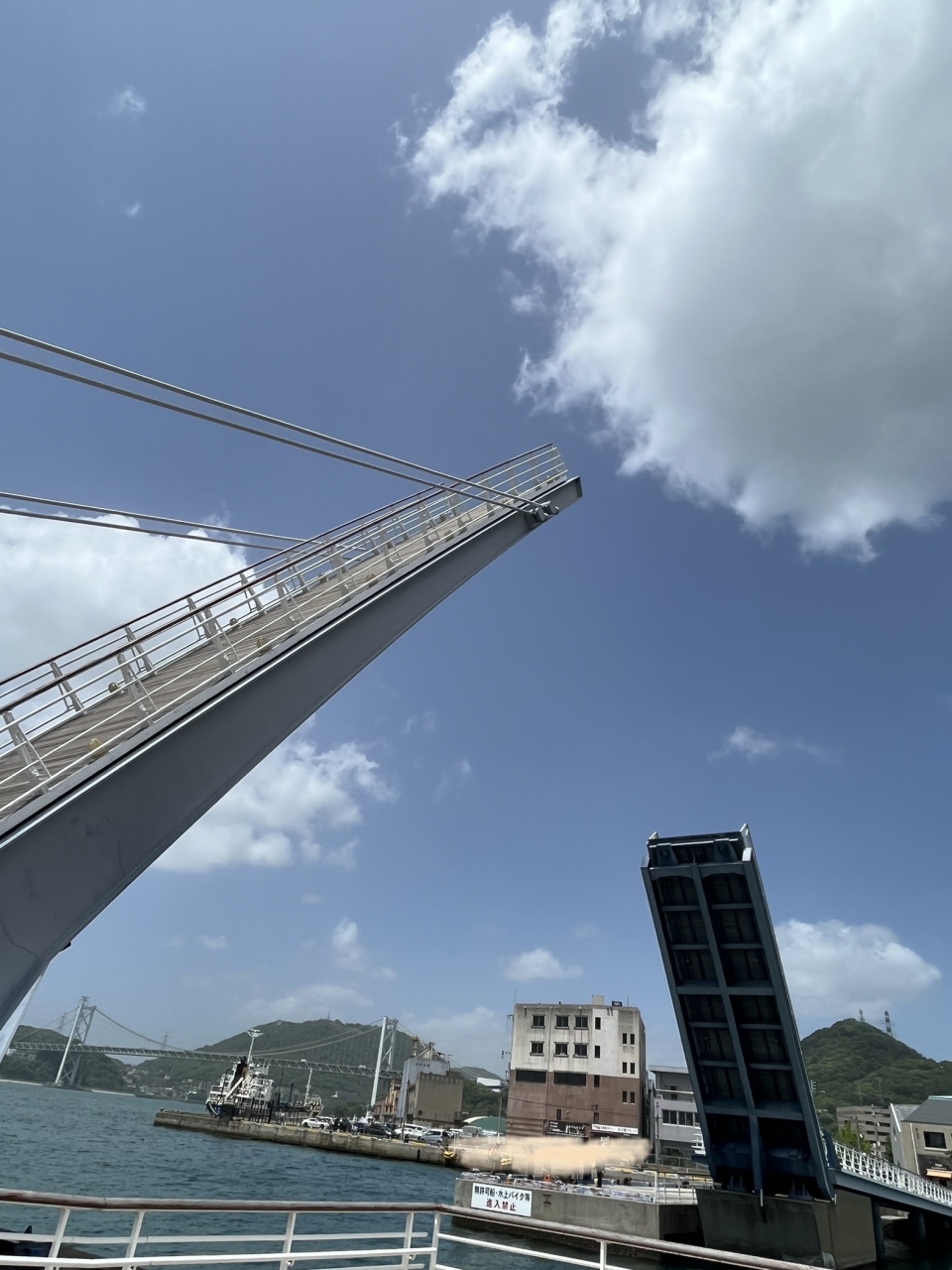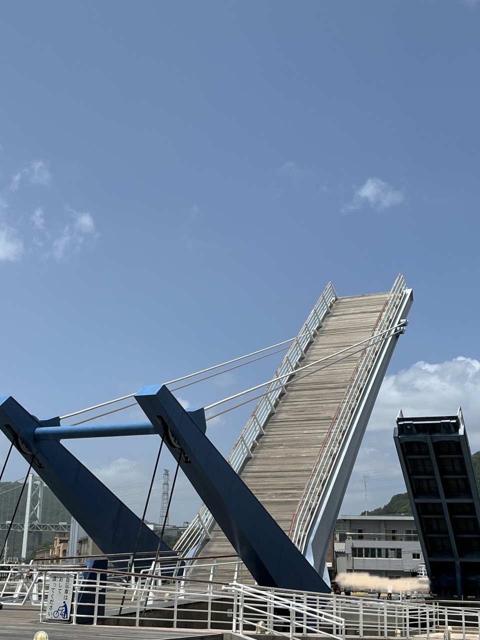 日本最大級の歩行者専用はね橋で 水面に対し60度の角度に跳ね上がる。