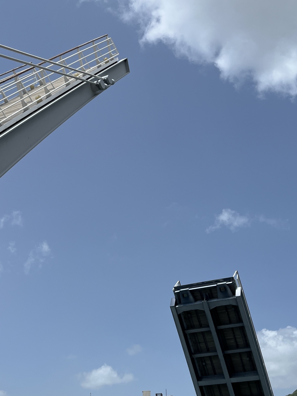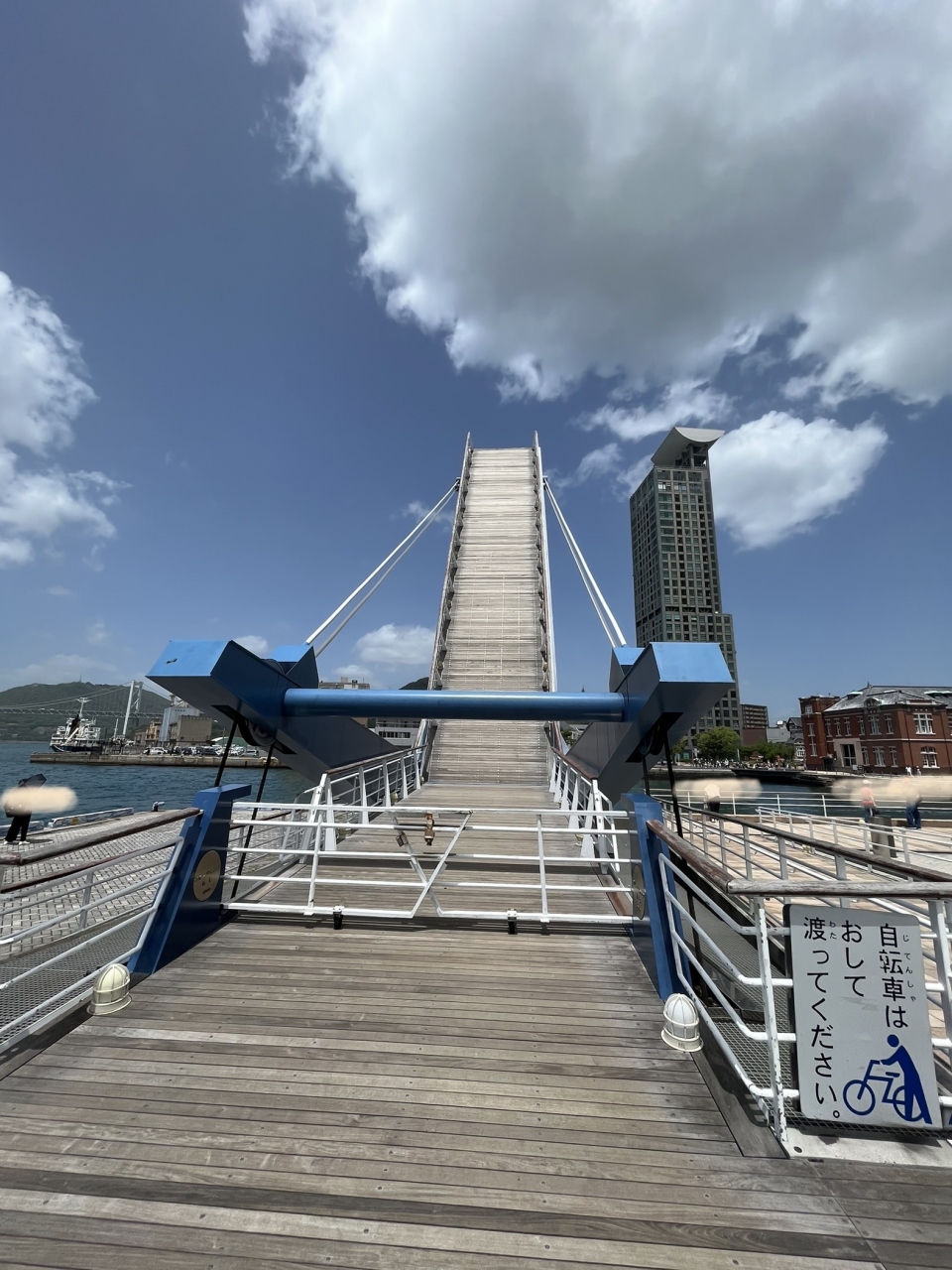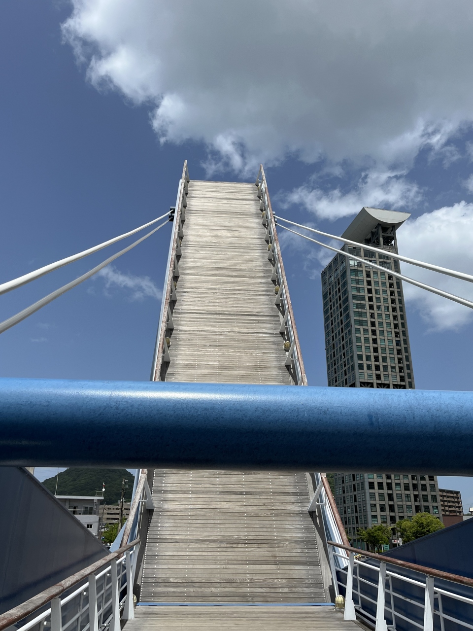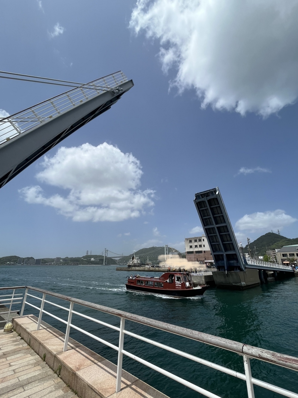 日本最大級の歩行者専用はね橋で 水面に対し60度の角度に跳ね上がる。