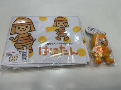 お食事したあと、高槻市のマスコットキャラクター「はにたん」の グッズが