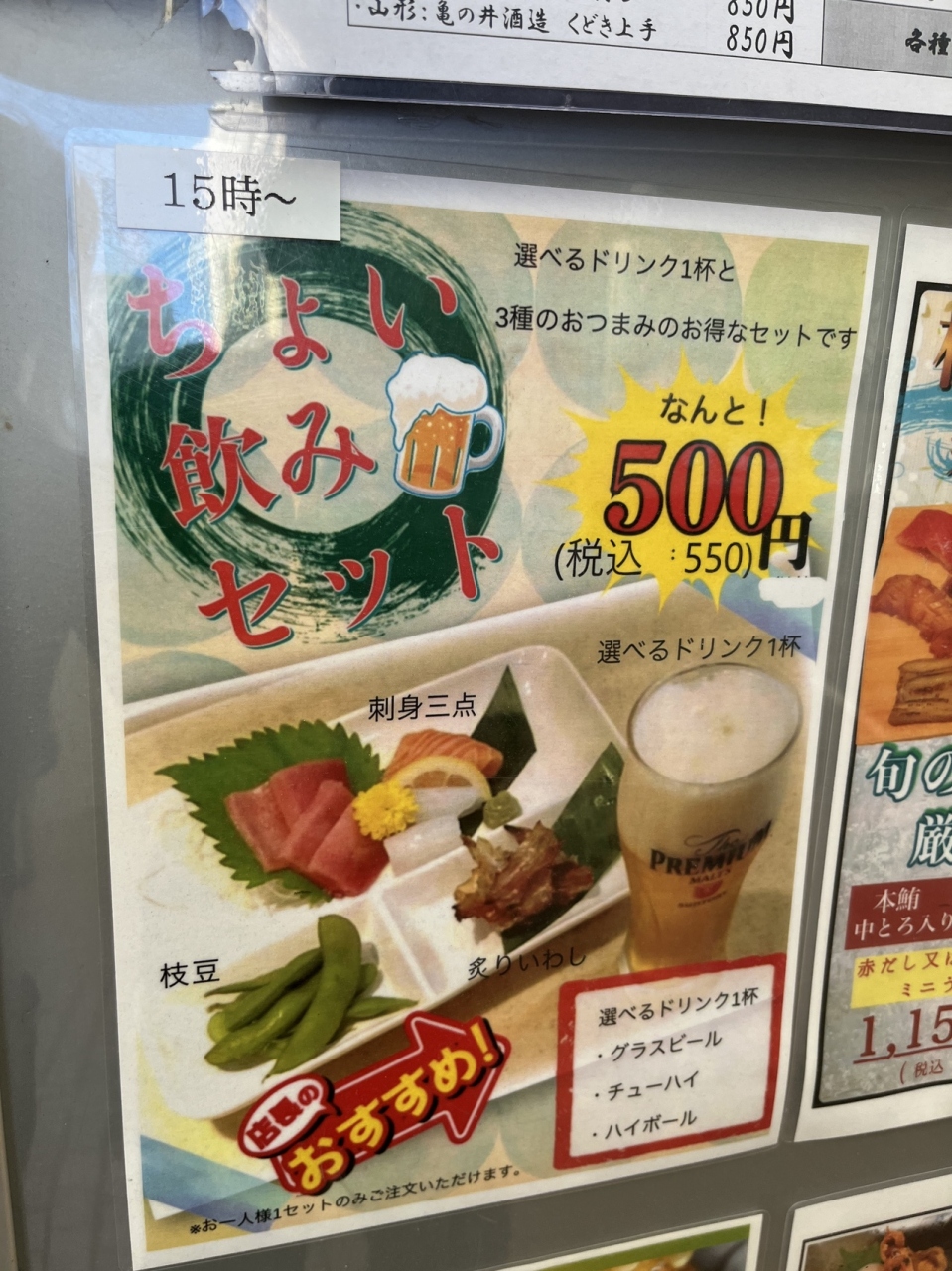 この時 「生ビール一杯」 半額 でした。期間限定です。