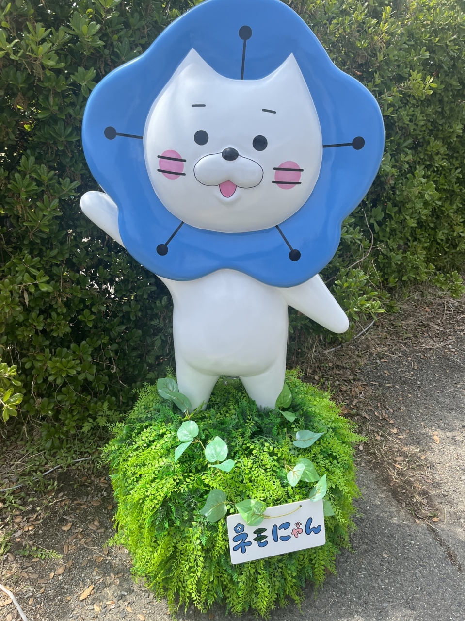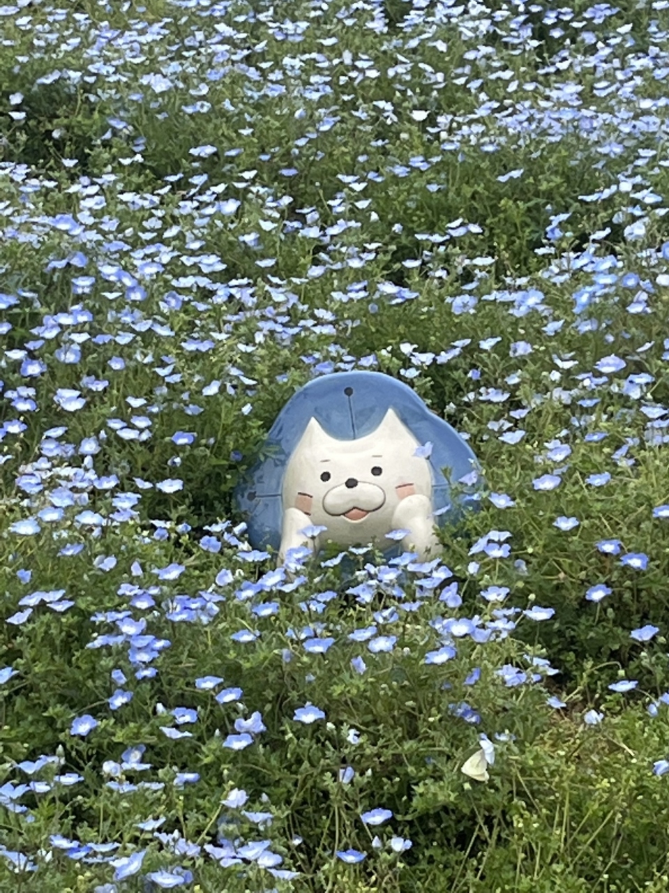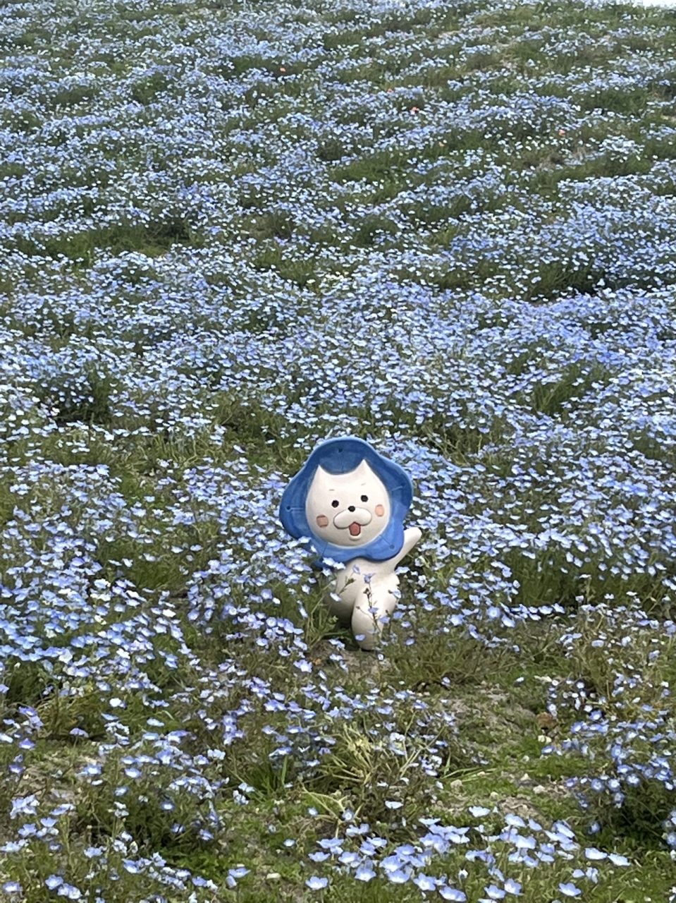 お花畑の中に 〈ネモにゃん〉が います。『ネモフィラ祭り』の公式キャラクターだそうです(^^)