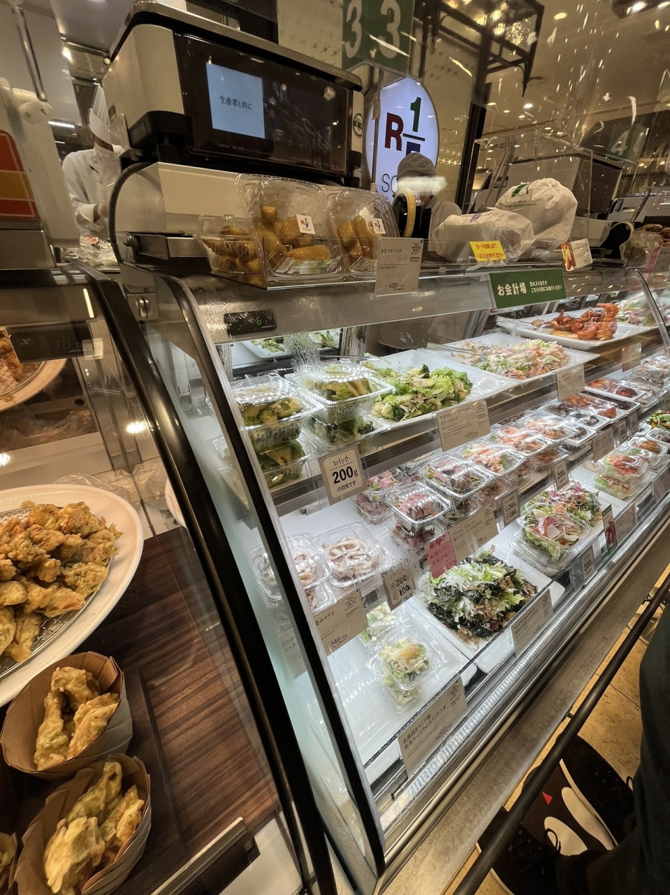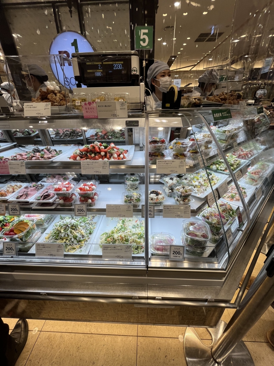 店内ガラスショーケースには、女性に人気のサラダが いろいろ 並んでいます。健康的です!