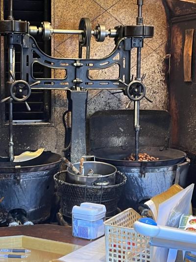 奥にある 大きな釜の中、機械でまわしながら 栗を煎り、焼き上げる様子が 見えます。