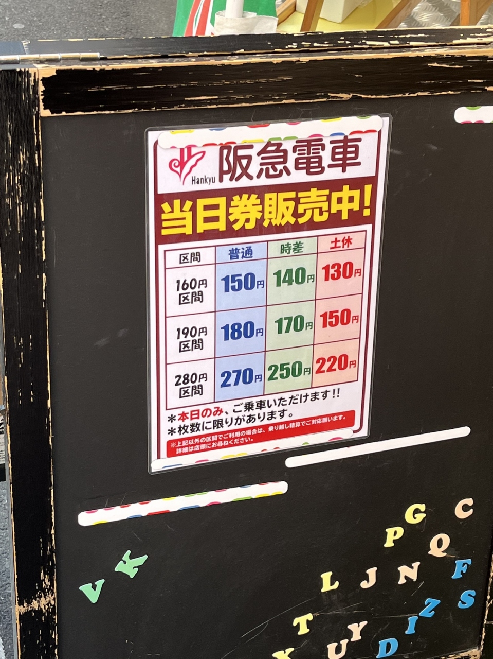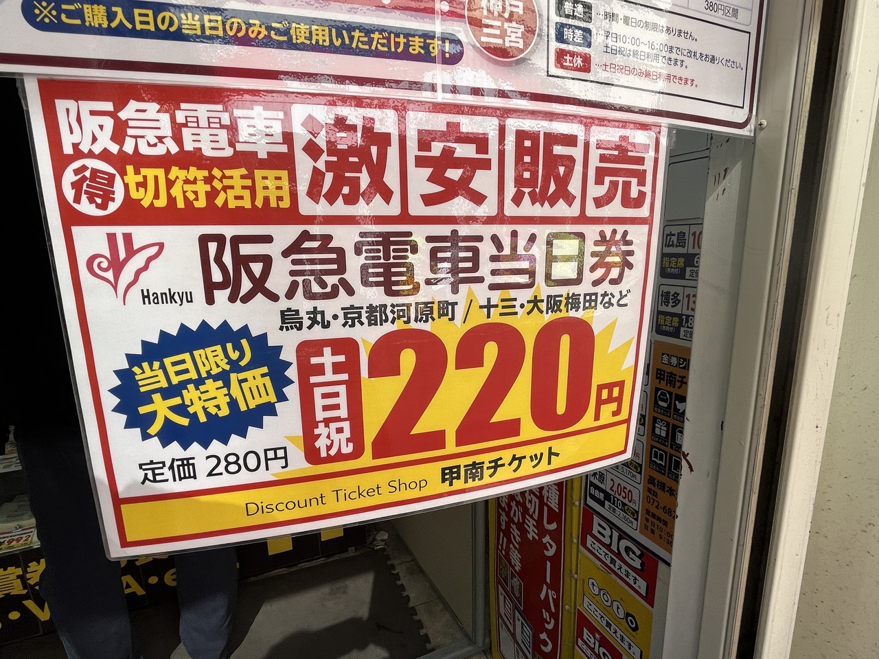 阪急電車当日券(土日祝)定価なら280円が 何と!220円です。