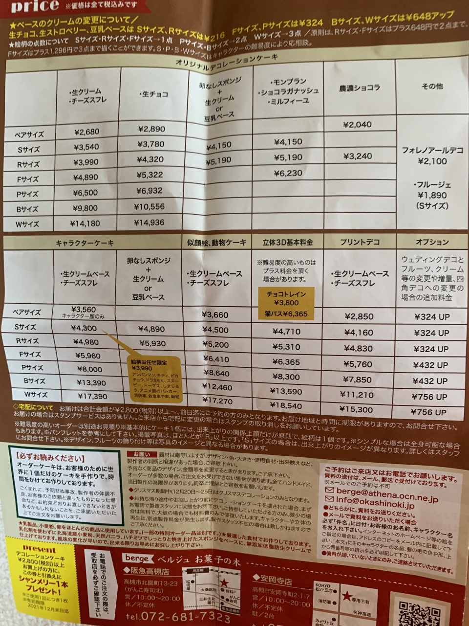 今回 ベルジュ オリジナル オーダー デコレーションケーキのパンフレットもらってきました。
