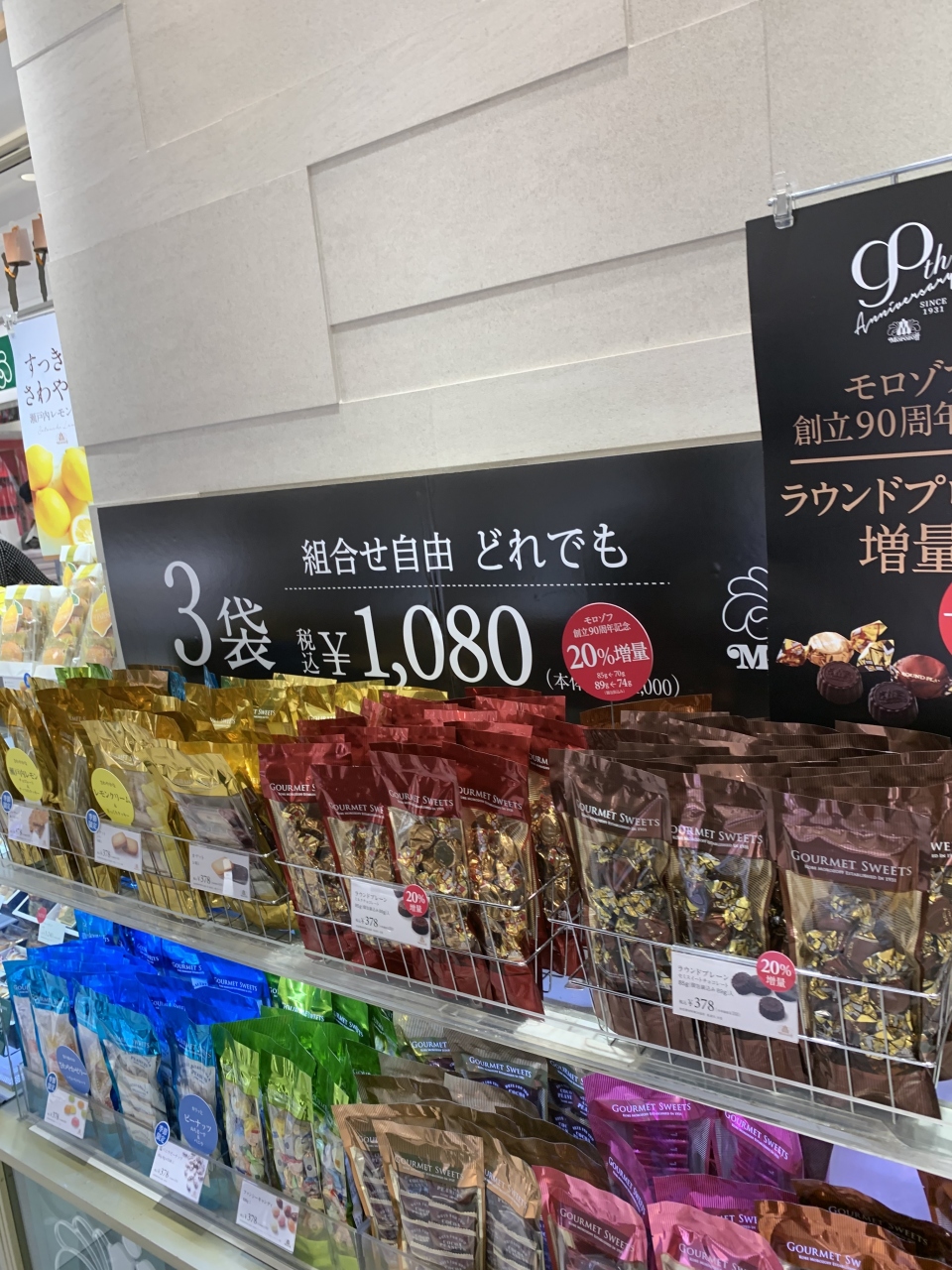 3袋組み合わせ自由1080円 は、『モロゾフ創立90周年記念』で通常より20%増量でした。- 旅行時期