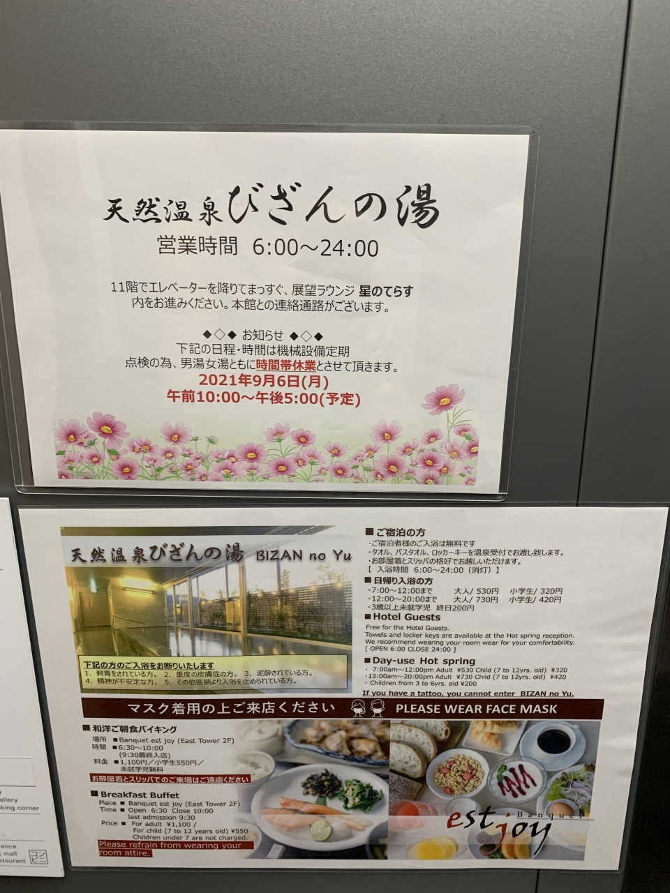 11F には 天然温泉「びざんの湯」があって 6時~24時 何回でも入浴できます。