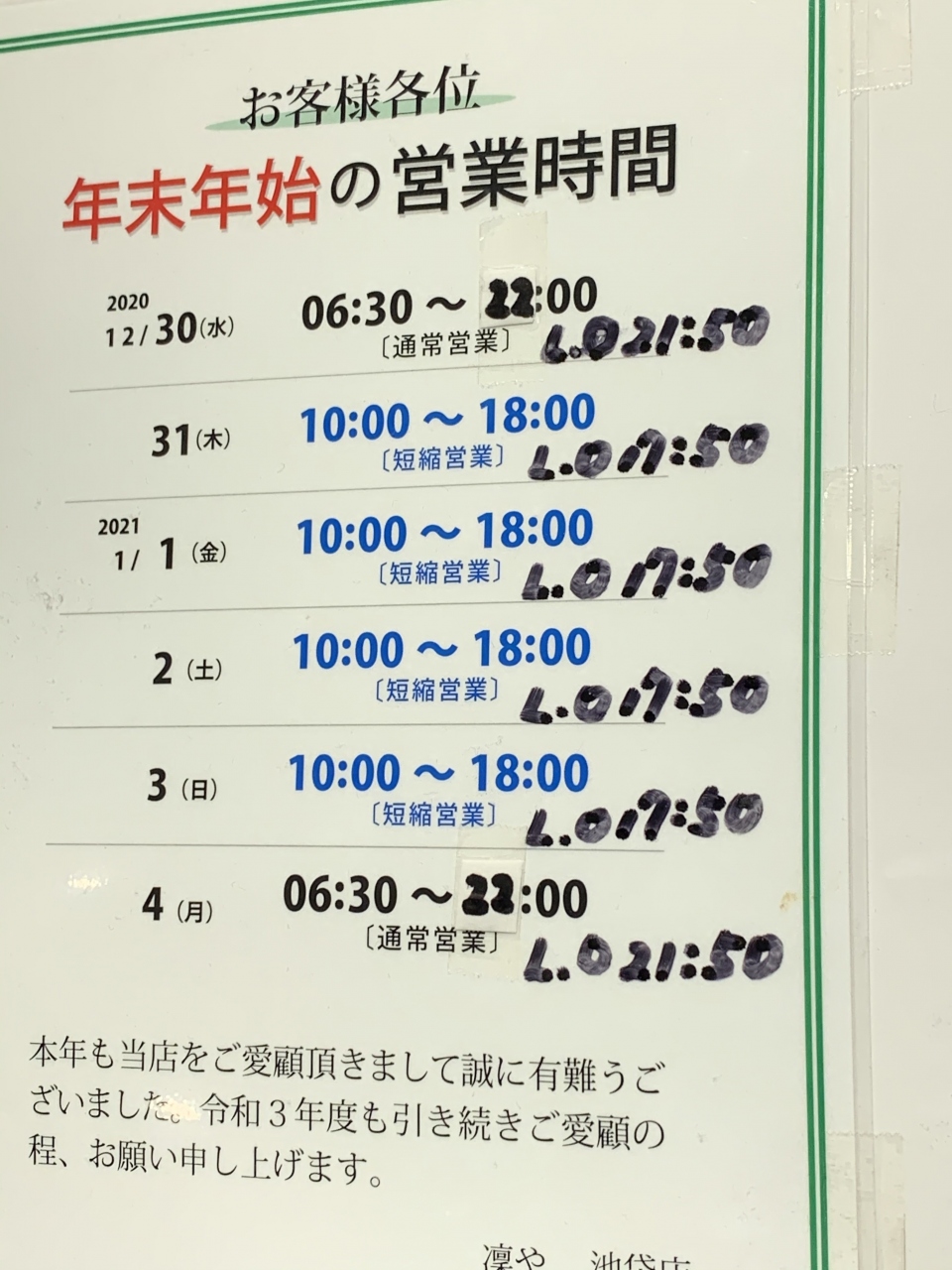この時は年末だったので 〈年末年始の営業時間〉が貼ってありました。