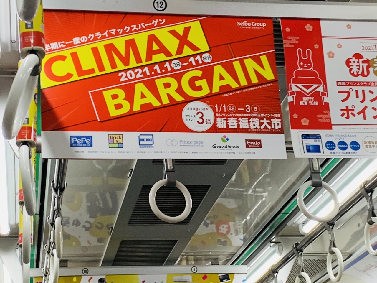 吊り革広告 西武グループの「新春福袋大市」 クライマックスバーゲン が目立っていました。