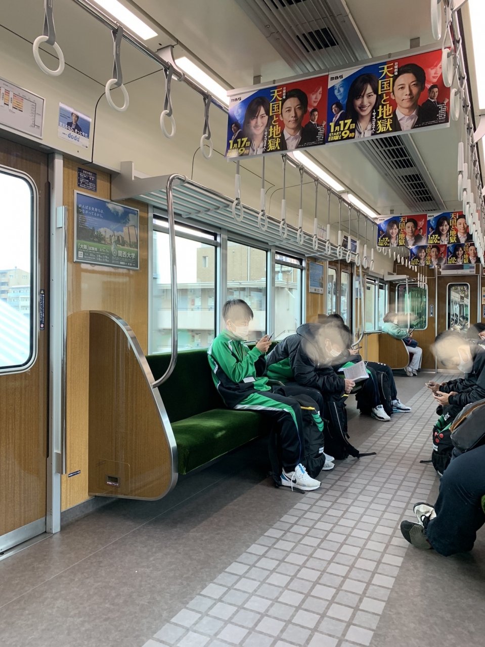 「西宮北口」駅からの普通車両には、乗客のほとんどが男子学生さんでした。
