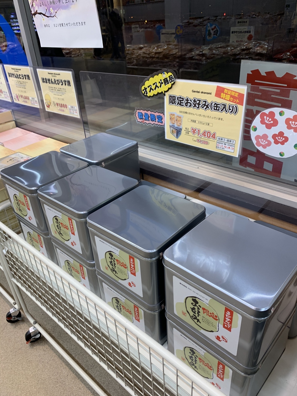 「浮世あられ」袋入り 他、ショーケースに おせんべいが並んでるので 楽しいですね