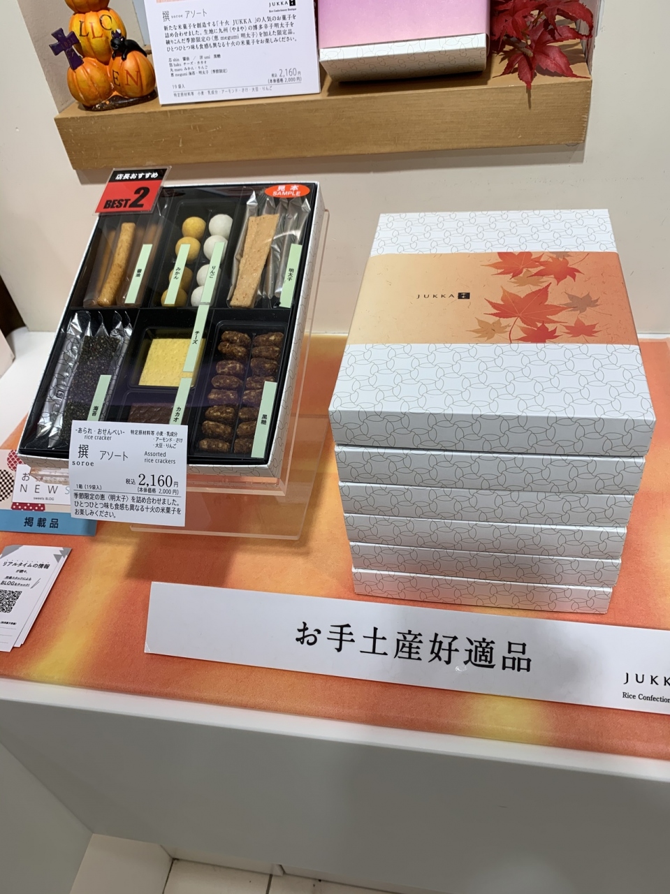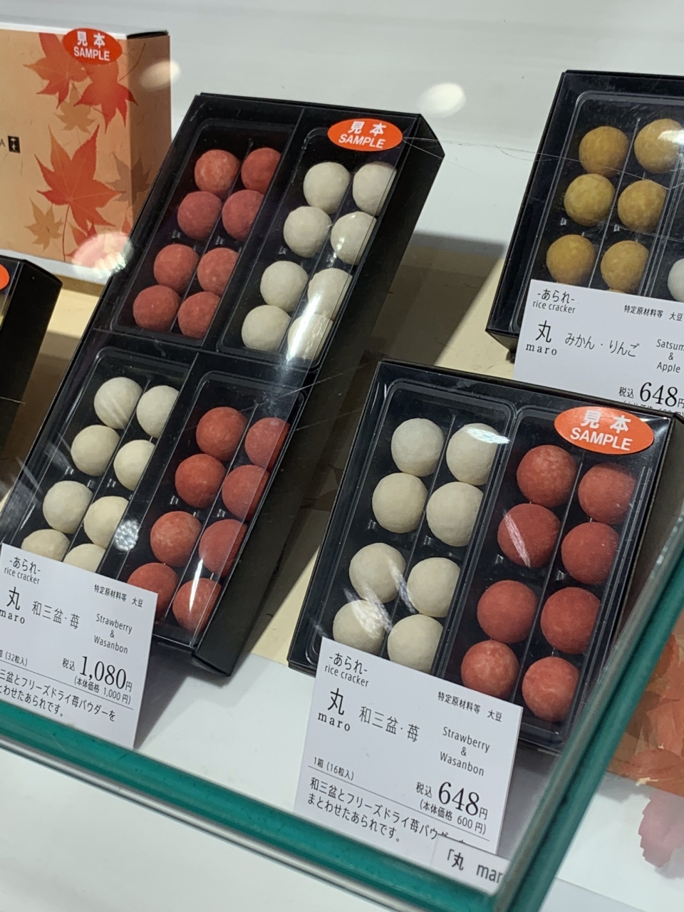 明るい店内には あられ や おせんべい などの米菓子 が オシャレに並んでいました。