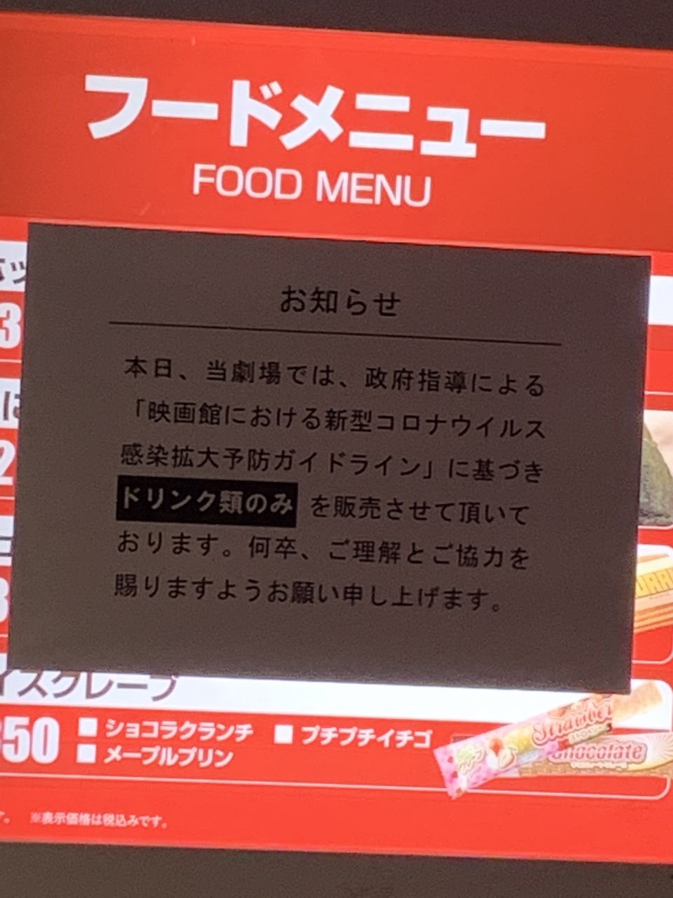 『 本日当劇場では 政府指導による~(略)…ドリンク類のみ販売させて頂いております。~(略)』