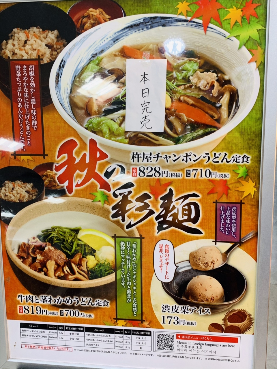 今 〈秋の彩麺〉 フェア やってますが、この日は 「杵屋チャンポンうどん定食」 本日完売でした。