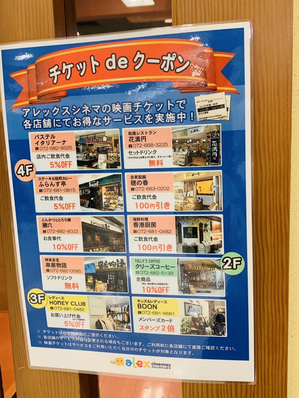 アレックスシネマの映画チケットで ご飲食代金 100円引き になります!