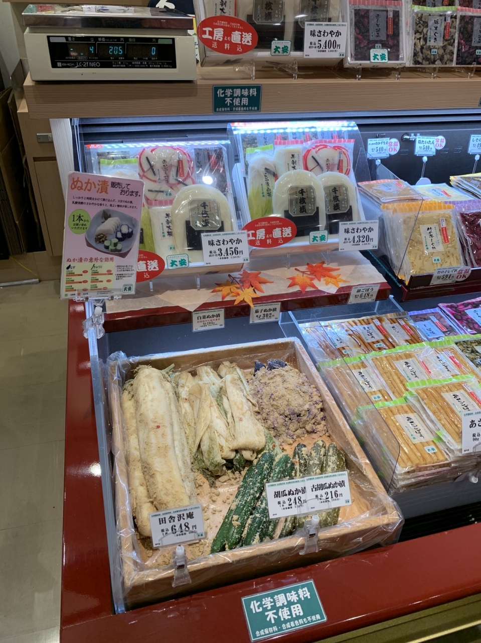 白菜ぬか漬け・茄子ぬか漬け・きゅうりぬか漬け・田舎沢庵 などなど…いろいろな種類のお漬け物があって迷います。