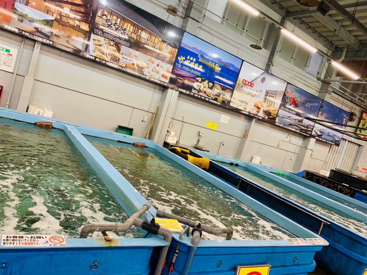 大きな 水槽の中には 生きたお魚が 泳いでいました。