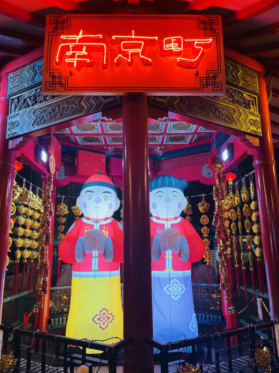 「南京町広場」の「あづまや」には 〈財財・來來〉の