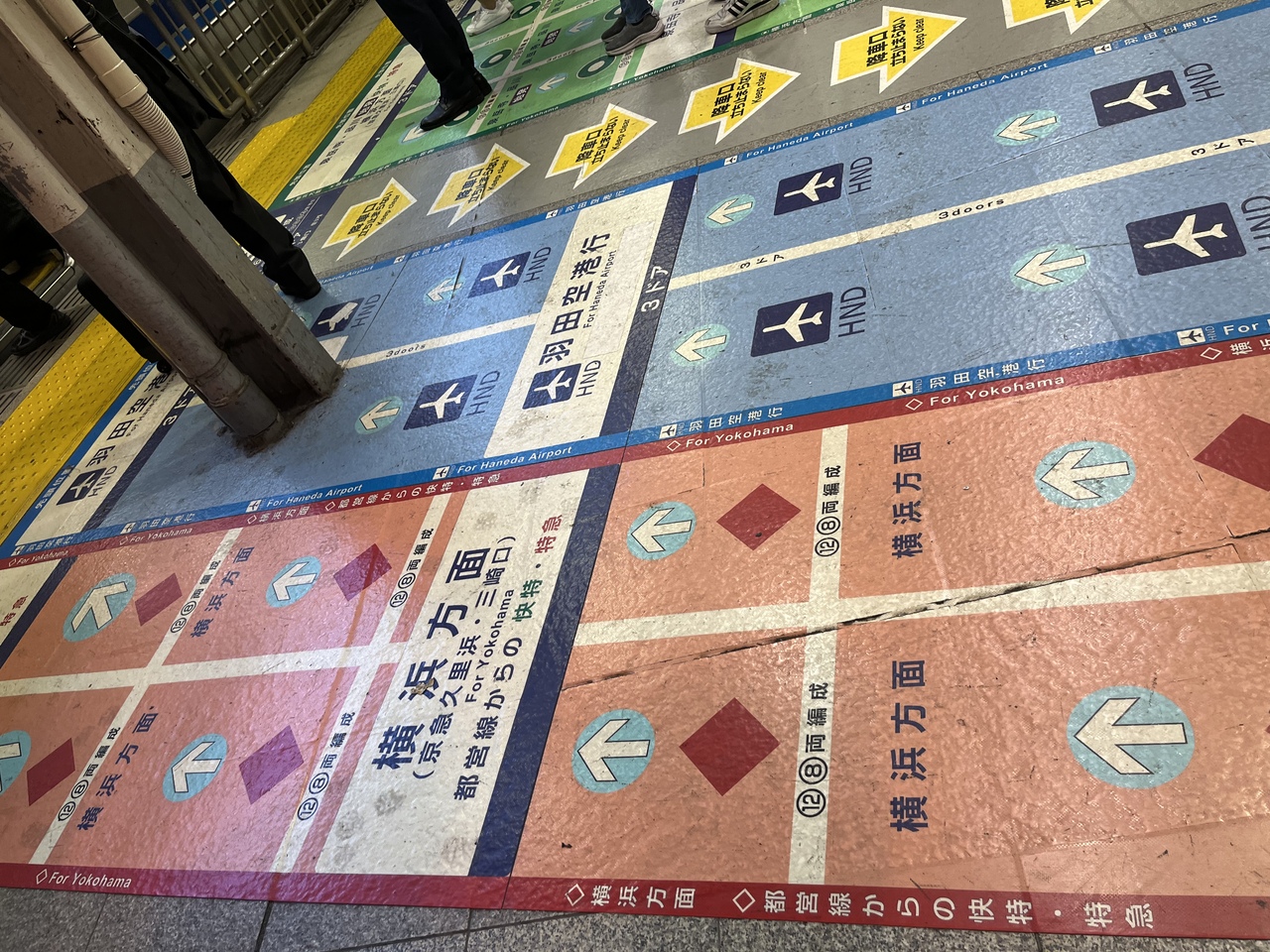 ホームの色分けの緑「快特」部分に 並んでいたら、なんだか変!