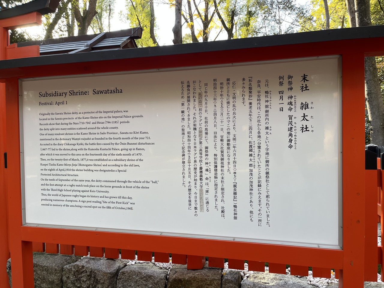 末社「雑太社」前の「糺の森」前の馬場にて、関西で初めてラグビーが行われました。