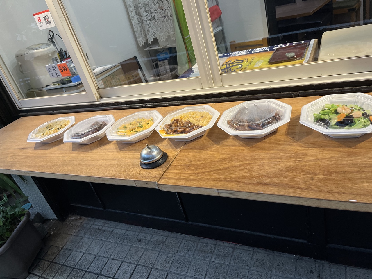 店頭には テイクアウトのお料理が並び、ベルを鳴らして 店内のスタッフに 知らせます。- 旅行時期