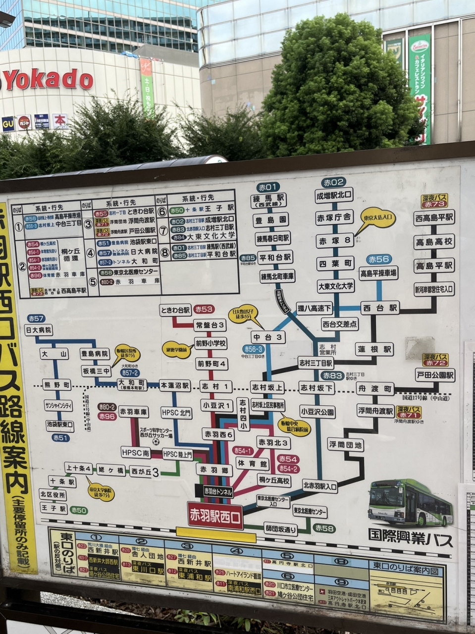 赤羽駅のロータリーには バスの路線案内 系統・行先・乗り場が書いてあるので、