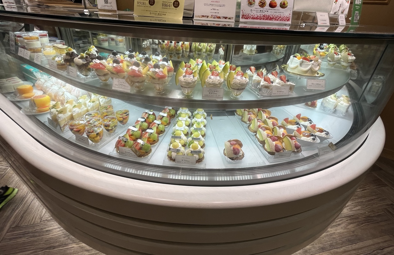 店内ガラスショーケースには「メロンタルト」「メロンパフェ」「フルーツタルト」が並び