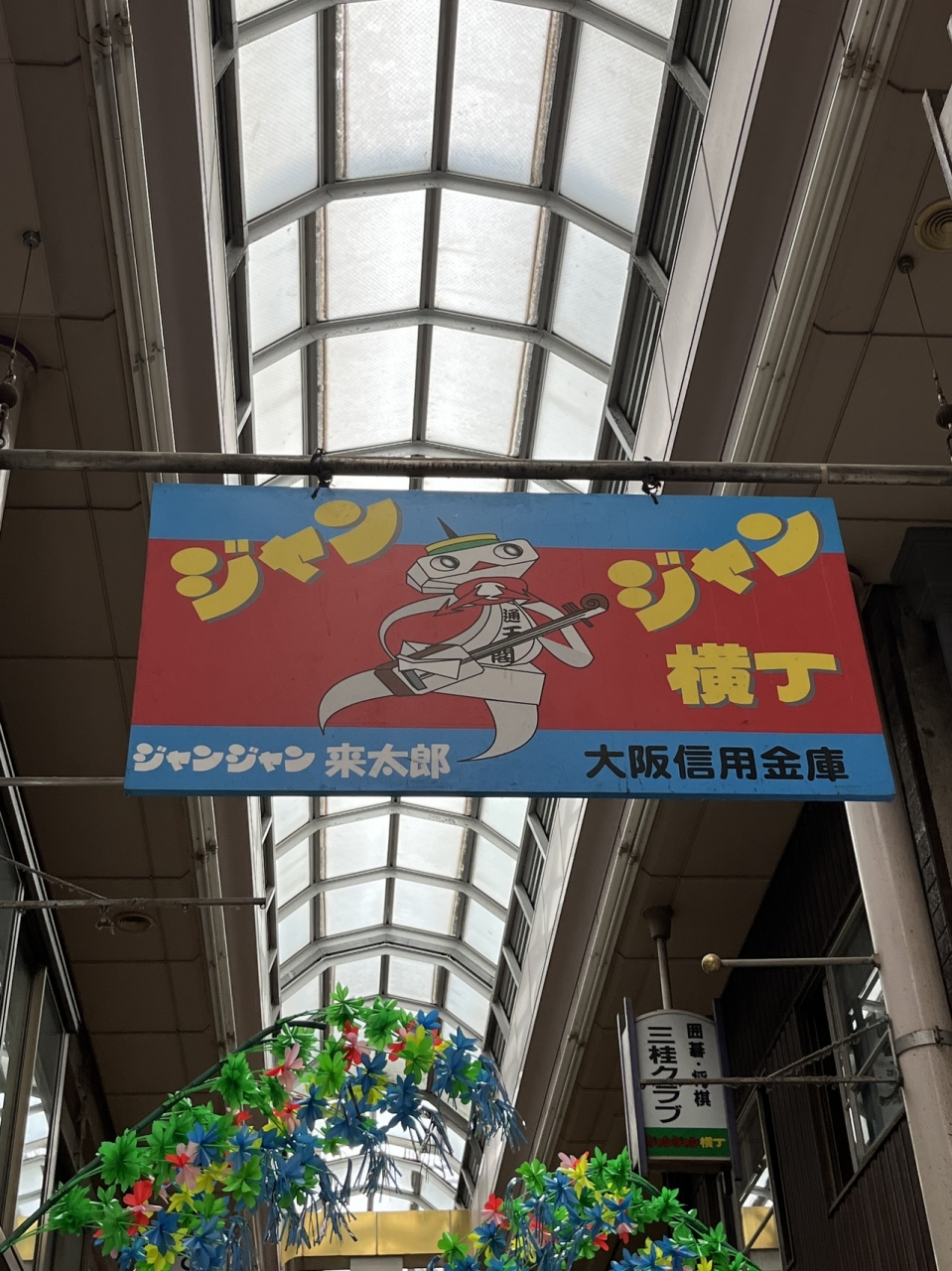 〈ジャンジャン来太郎〉が アーケードの上の方から お出迎えしてくれます