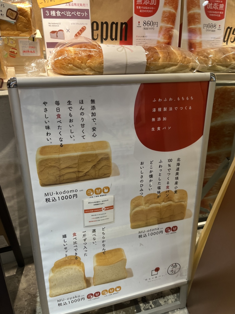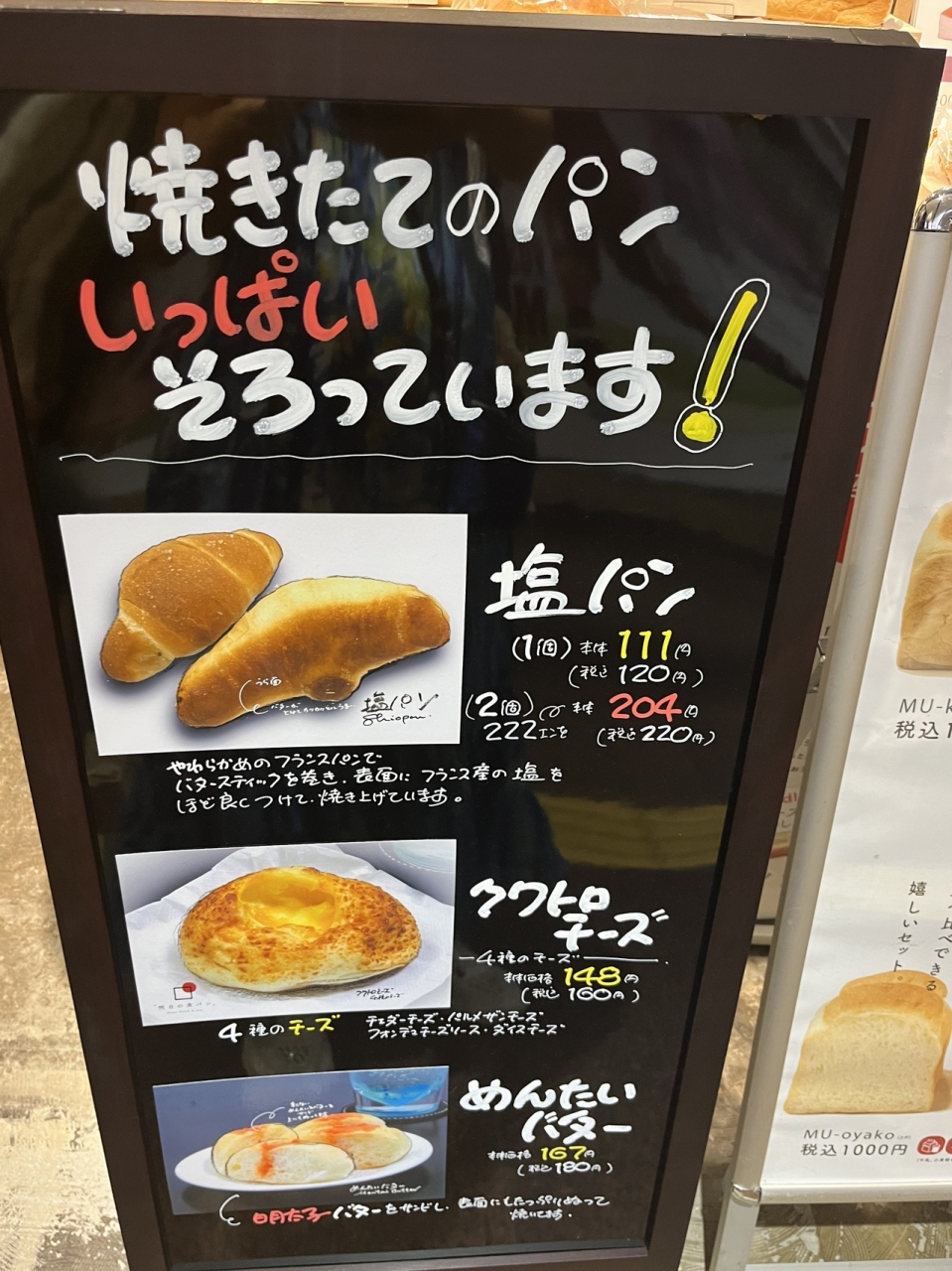 店名の「食パン」のほかに 「塩パン」「クワトロチーズ」「めんたいバター」などなど